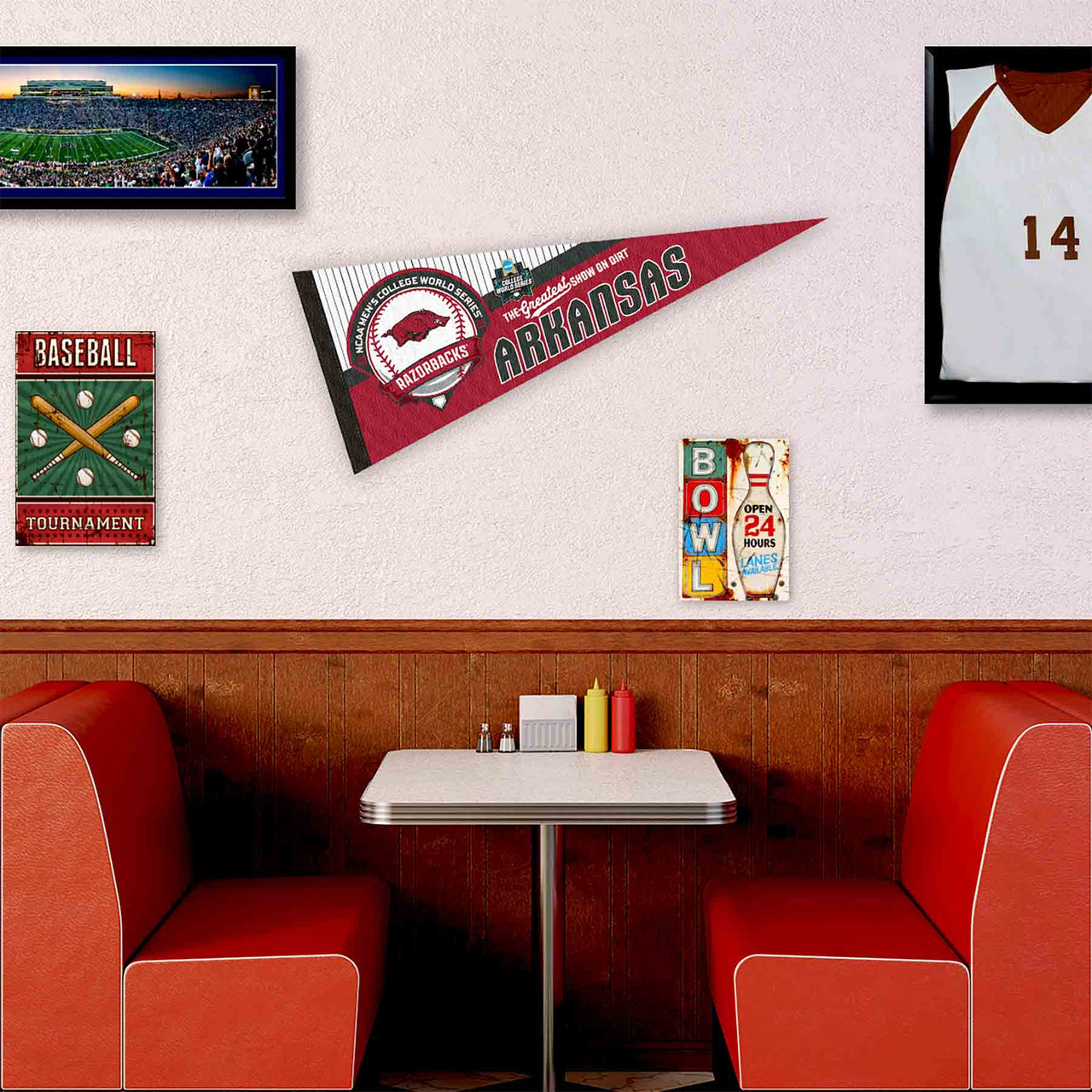 Our Pennant Flag is a great way to show your college allegiance in your sports room, game room, office, bedroom, or any room by displaying as a wall banner. These pennants measure 12 in X 30 in, are made of Felt, and are single-sided Screen Printed with Razorbacks insignias and logos. Each Flag, Banner or Pennant is Officially Licensed and Team, College, or University Approved approved which insures current insignias, wordmarks, and authentic colors. These pennants also include a sewn pennant stick sleeve on the left side which can be used to insert a pennant stick, if desired.