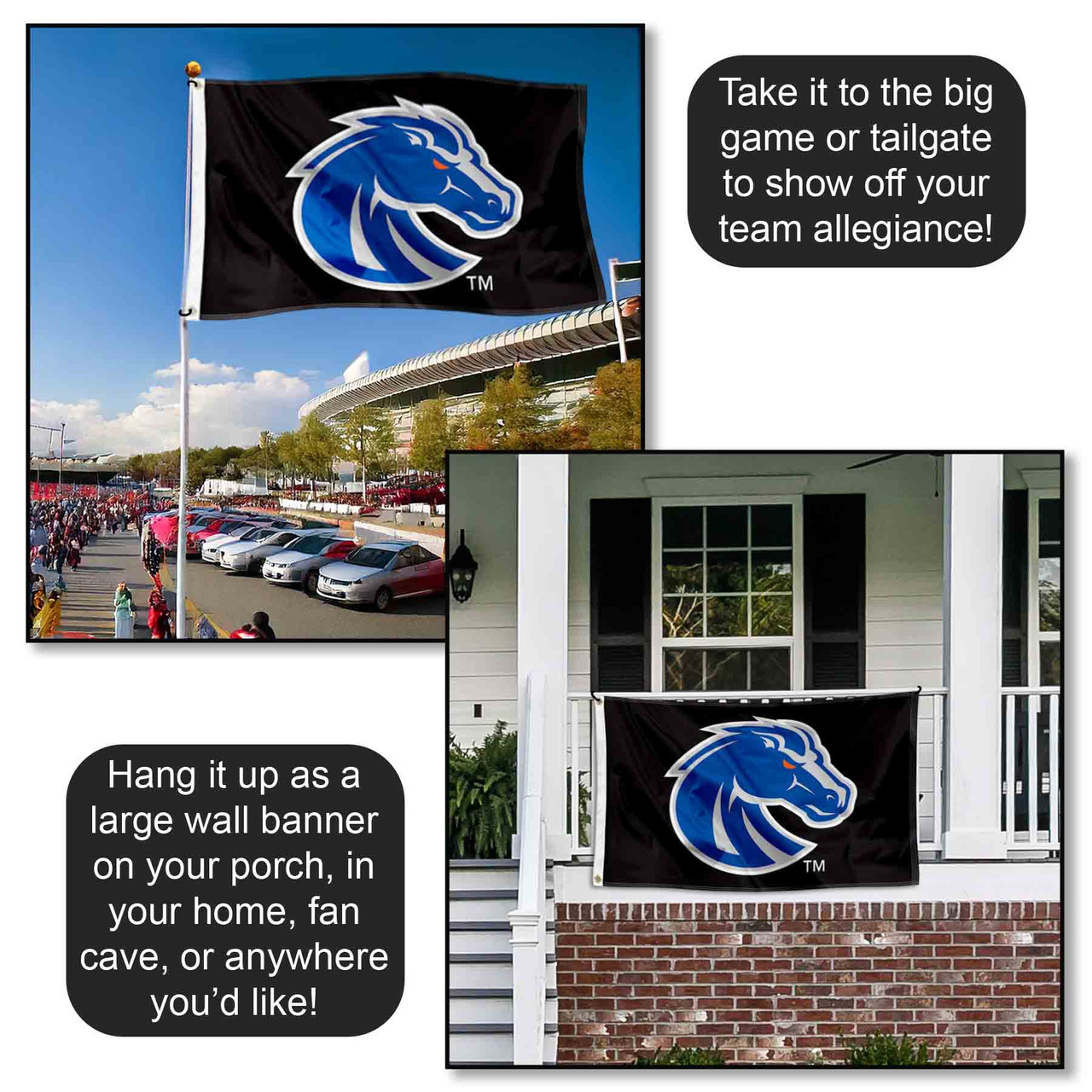 Our Boise State Broncos Black 3x5 Flag measures 3x5 feet in size, has quadruple-stitched fly ends, is made of durable polyester, and has two metal grommets for attaching to your flagpole. The screen printed Boise State logos are Officially Licensed and Approved by Boise State University and are viewable from both sides with the opposite side being a reverse image.