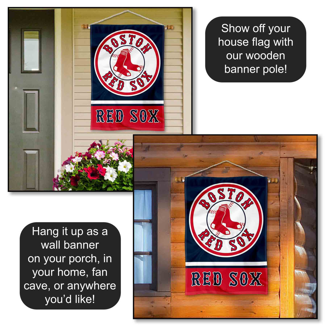 Our House Flag for Boston Red Sox measures 28 in x 40 in in size, has a Double Stitched Perimeter, is made of 2-Ply Polyester with sewn-in liner, has Double Sided Screen Printed logos, and has a 3" top pole sleeve to slide over your flagpole or banner pole. This Flag, Banner or Pennant is Viewable and Readable Correctly on Both Sides and is League Genuine Merchandise and licensed by Team which ensures a quality item, hologram packaging, authentic logos, and genuine team colors.