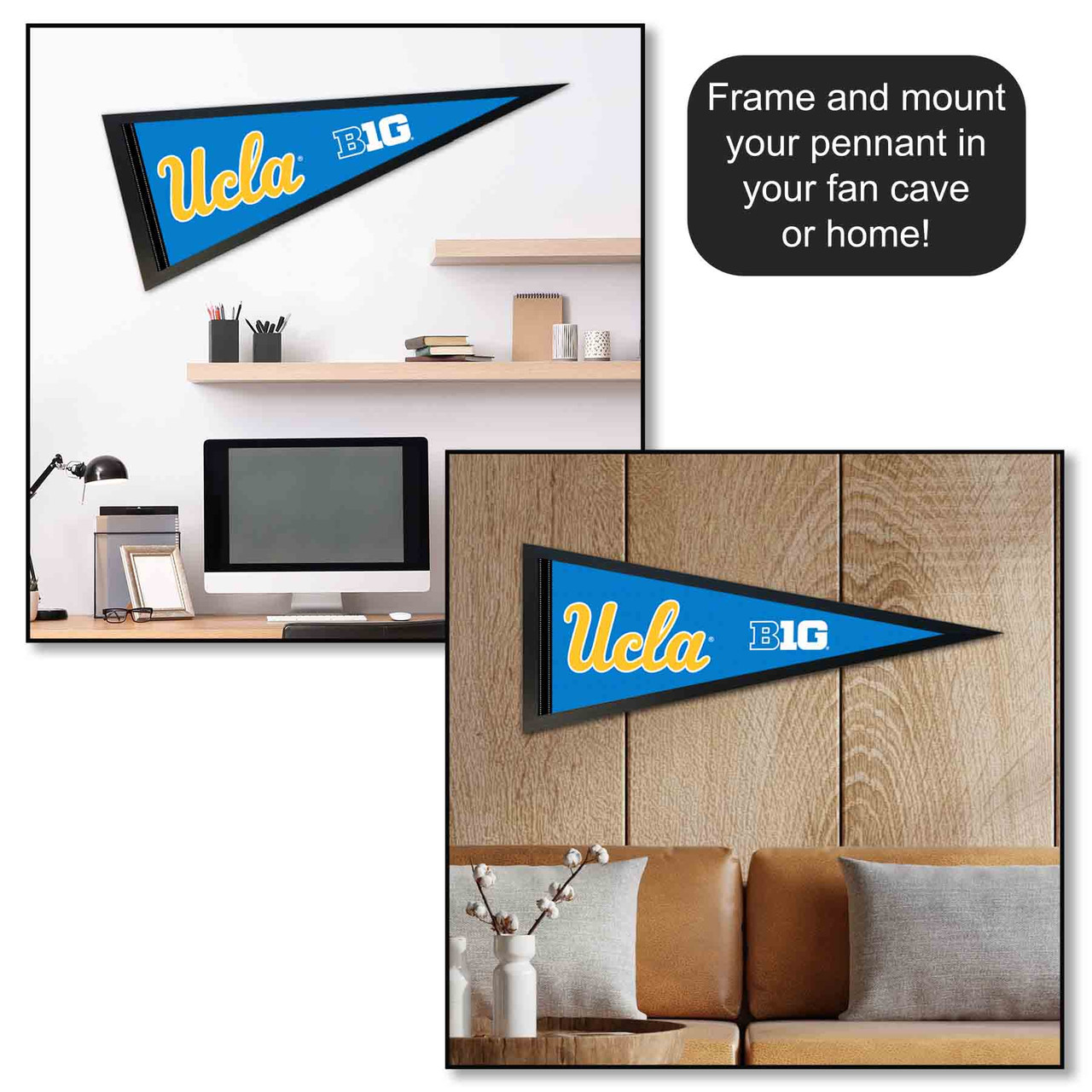 Our Pennant Flag is a great way to show your college allegiance in your sports room, game room, office, bedroom, or any room by displaying as a wall banner. These pennants measure 12 in X 30 in, are made of Felt, and are single-sided Screen Printed with Bruins insignias and logos. Each Flag, Banner or Pennant is Officially Licensed and Team, College, or University Approved approved which insures current insignias, wordmarks, and authentic colors. These pennants also include a sewn pennant stick sleeve on the left side which can be used to insert a pennant stick, if desired.