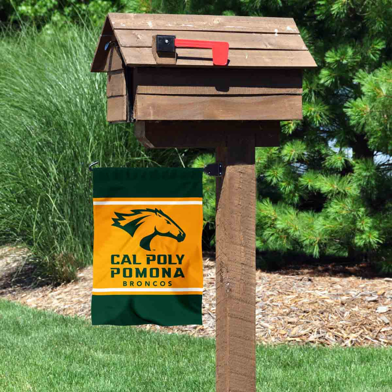 Ideal for your garden or home entrance is our Flag, Banner or Pennant for your favorite college team. This double sided garden banner flag measures a large 13 in x 18 in, has a Double Stitched border, a 1 inch top sleeve, and is made of 2 ply Polyester with sewn in liner, so the logos are Viewable and Readable Correctly on Both Sides. The Screen Printed CPP Broncos logos are Officially Licensed and College, University, or Team Approved. Please Note: Garden Flag Stand, Mailbox Poles, and all Accessories are sold separately.