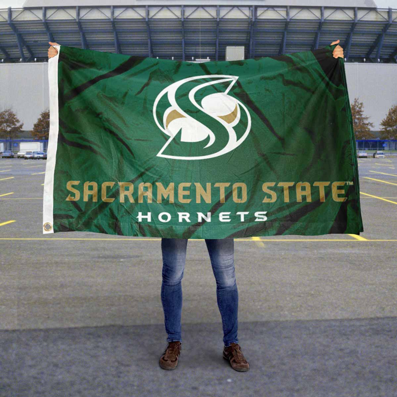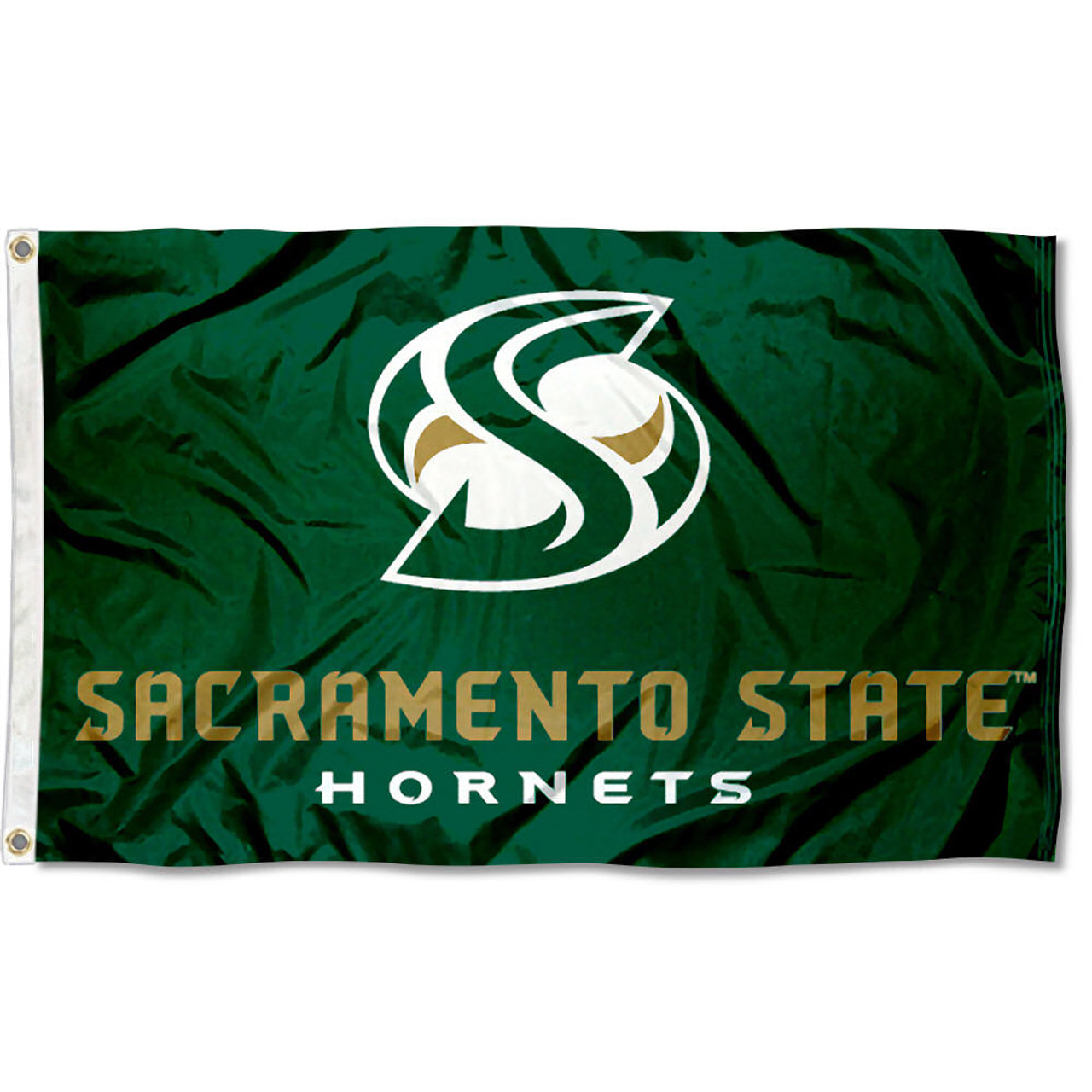 This Sacramento State Flag measures 3x5 feet in size, has quadruple-stitched fly ends, is made of durable 100% Nylon, and has two metal grommets for attaching to your flagpole. The screen printed California State University Sacramento logos are Officially Licensed and Approved by California State University Sacramento and are viewable from both sides with the opposite side being a reverse image.