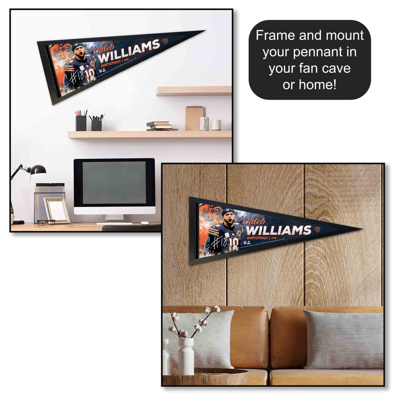 Our football pennants are a great way to show your League allegiance in your sports room, game room, office, bedroom, or any room by displaying on any wall as a banner. These pennant flags measure a full size 12 in X 30 in, are made of Felt Blend, and are single-sided Screen Printed with the insignias and logos, as shown. Each banner is Officially Licensed by the selected team which insures current insignias, wordmarks, and authentic colors. These pennants also include a pennant sleeve on the left side which can be used to insert a pennant stick, if desired.