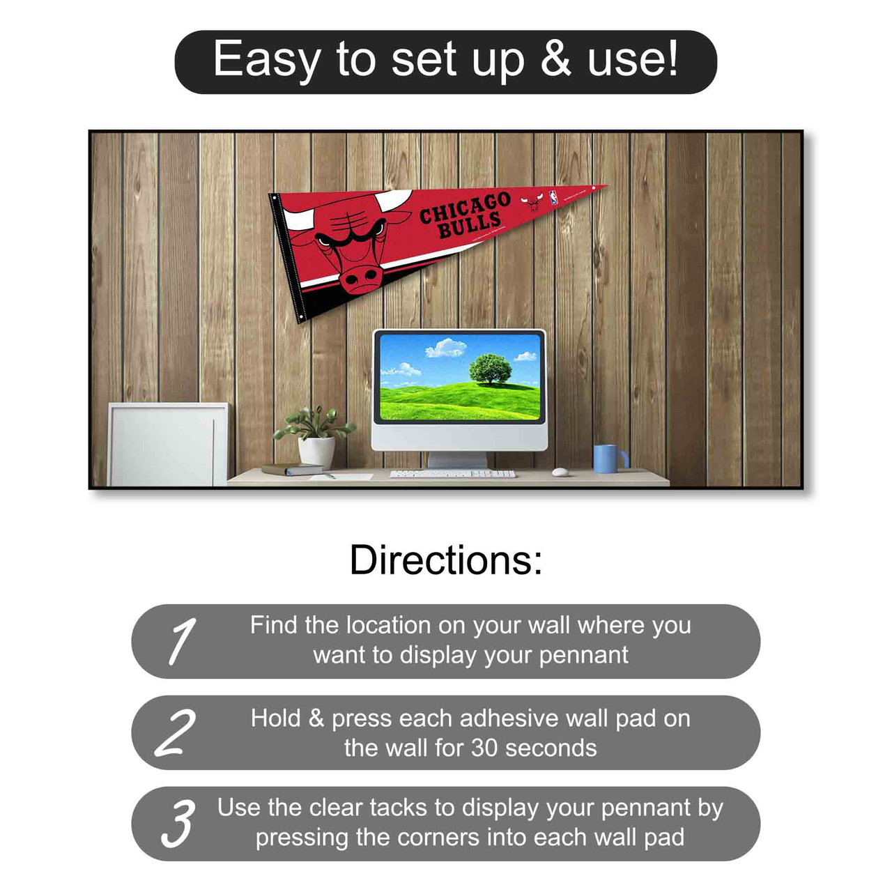 This logo banner set is a great way to show your team allegiance in your sports room, game room, office, bedroom, fan cave, garage, or any room by displaying on any wall. These pennant flags measure a full size 12 in X 30 in, are made of Felt Blend, and are single-sided Screen Printed with the insignias and logos, as shown. Each banner is Officially Licensed by the selected team which insures current insignias, wordmarks, and authentic colors. Also, a pack of 6 Wall Pads and 6 Tacks are included which enable you to display on any wall. This ready to hang kit provides the pennant with a drop shadow while the tacks attach your pennant to the 3/8 inch thick adhesive wall pads. Easy directions are to find the location on the your wall to display your pennant. Hold and press each adhesive pad for 30 seconds. Use included tacks to display your pennant by pressing the corners into each pad.