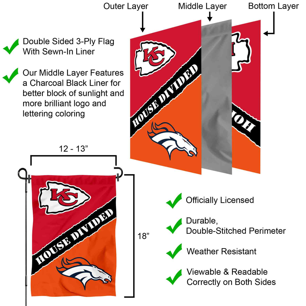 Perfect for your garden, home entrance, or as a wall banner is our Flag, Banner or Pennant. This double sided League Garden Flag measures a large 12.5 in x 18 in, has a Double Stitched border, a 1.5 inch top sleeve, and is made of 2 ply Polyester with sewn-in liner so the logos are Viewable and Readable Correctly on Both Sides. The Screen Printed Team logos are League Officially Licensed and Approved by the Team, College, or University. (Flag Only, Accessories Sold Separately)