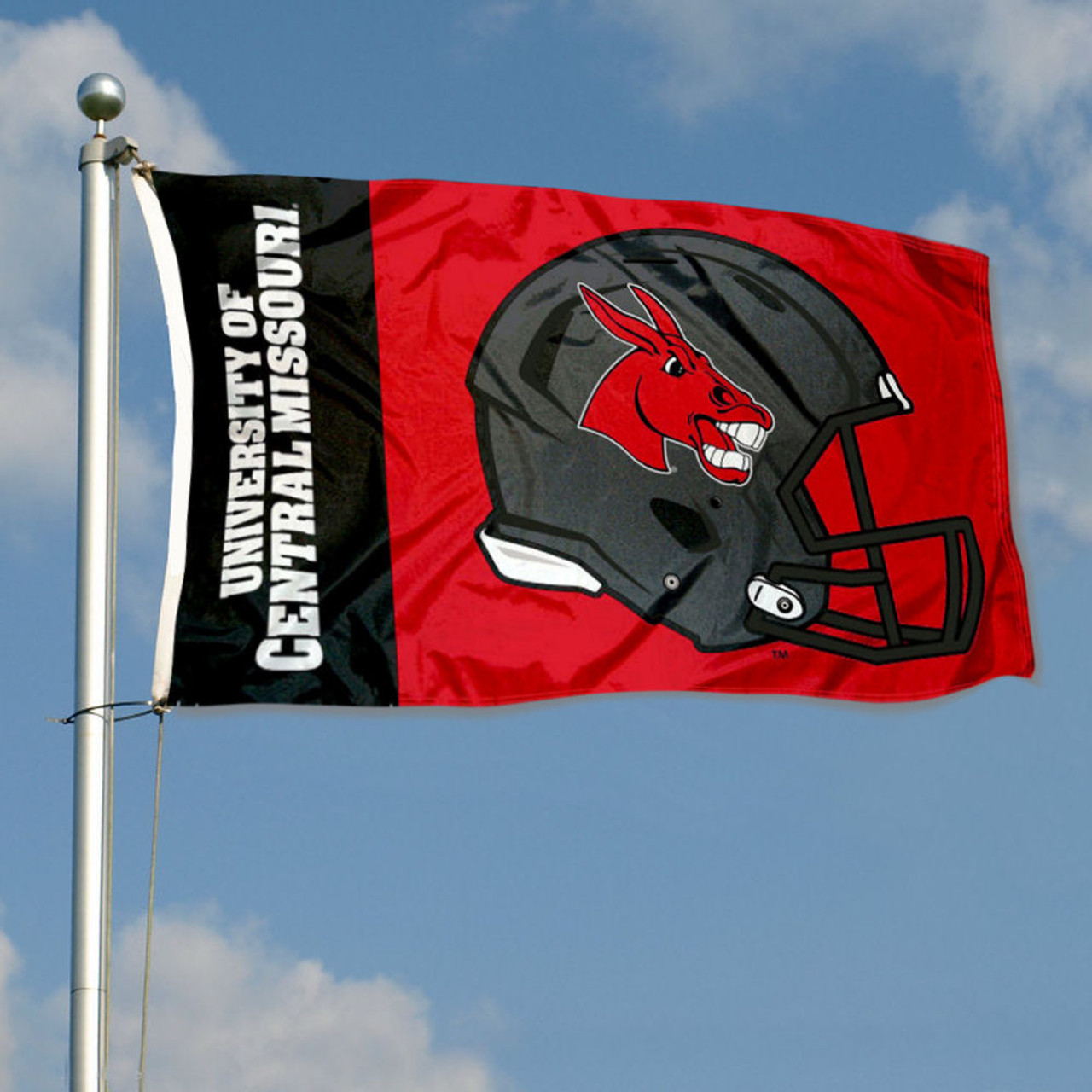 This Flag, Banner or Pennant measures 3 ft x 5 ft in size, has Quadruple Stitched fly ends, is made of durable Polyester, and has two Metal Grommets for attaching to your flagpole. The Screen Printed CMU Mules logos are Officially Licensed and College, University, or Team Approved and are Viewable from Both Sides (Opposite Side is a Reverse Image).