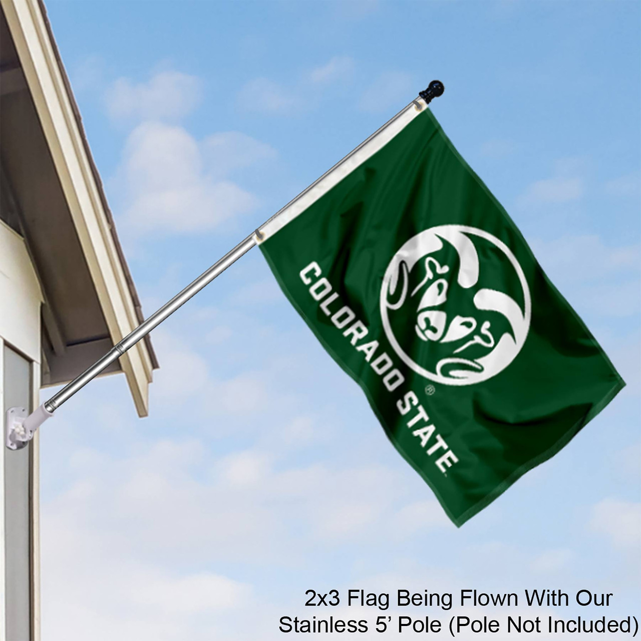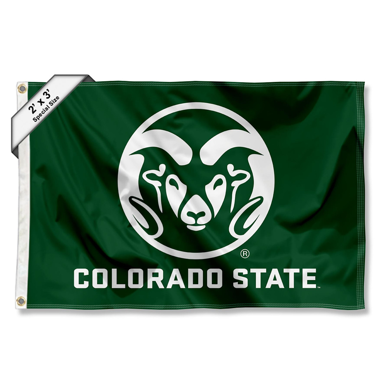 This small Flag, Banner or Pennant measures 2 ft x 3 ft in size, has Quadruple Stitched fly ends for extra durability, is made of single-ply Polyester, and has two Metal Grommets for attaching to your flagpole. The Screen Printed CSU Rams logos are Officially Licensed and Team, College, or University Approved Approved and are Viewable on Both Sides (Opposite Side is a Reverse Image).