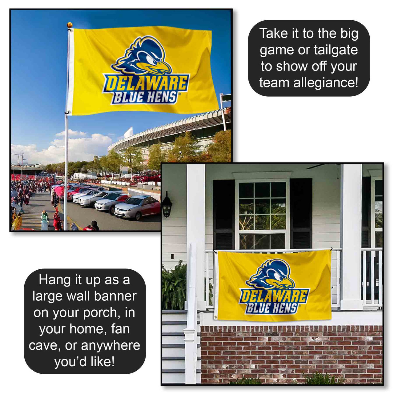 This outdoor grommet banner flag measures 3 ft x 5 ft in size, has Quadruple Stitched fly ends, is made of durable Polyester, and has two Metal Grommets for attaching to your flagpole, tailgating flag pole, or for hanging as a large banner. The Screen Printed team logos are Officially Licensed and University approved. The printed insignia are Viewable from Both Sides (Opposite Side is a Reverse Image). Poles, Brackets, and Accessories sold separately.