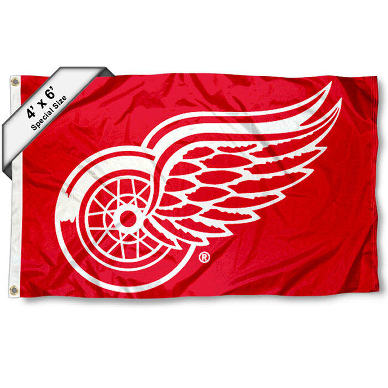 This Detroit Red Wings Large Flag 4x6 Feet Banner measures a large 4x6 feet in size, has quadruple-stitched fly ends, is made of durable polyester, and has two metal grommets for attaching to your flagpole or tailgating flagpole. The screen printed Detroit Red Wings logos are NHL Licensed Merchandise and are viewable from both sides with the opposite side being a reverse image.
