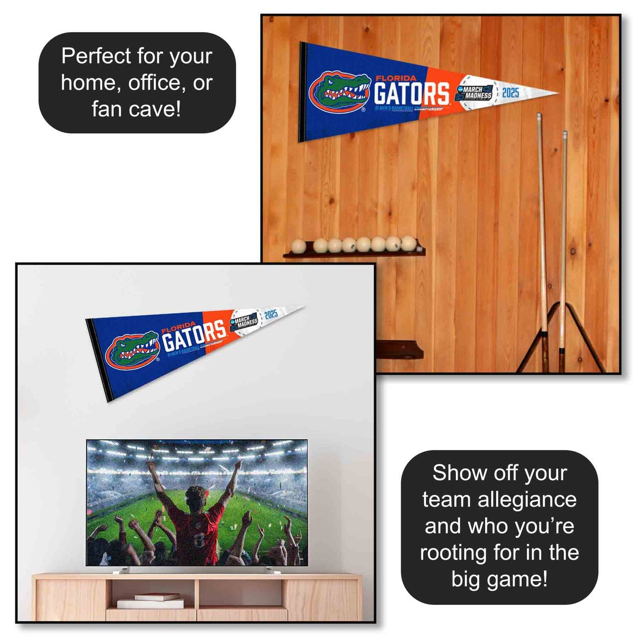Our Pennant Flag is a great way to show your college allegiance in your sports room, game room, office, bedroom, or any room by displaying as a wall banner. These pennants measure 12 in X 30 in, are made of Felt, and are single-sided Screen Printed with Gators insignias and logos. Each Flag, Banner or Pennant is Officially Licensed and Team, College, or University Approved approved which insures current insignias, wordmarks, and authentic colors. These pennants also include a sewn pennant stick sleeve on the left side which can be used to insert a pennant stick, if desired.