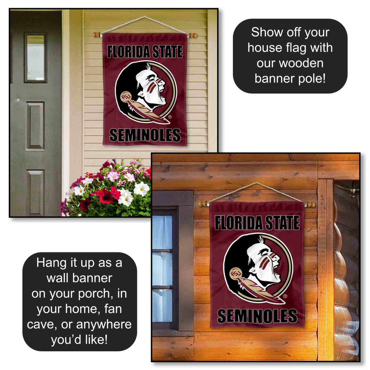 Our Florida State University House Flag is 30x40 inches in size, is made of Two-Ply Polyester with Liner, has a top sleeve for insertion of a flagpole or banner pole, and is fully Double Sided. These House Banners and Flags are Viewable and Readable Correctly on both sides and are Officially Licensed by the League and Florida State University.