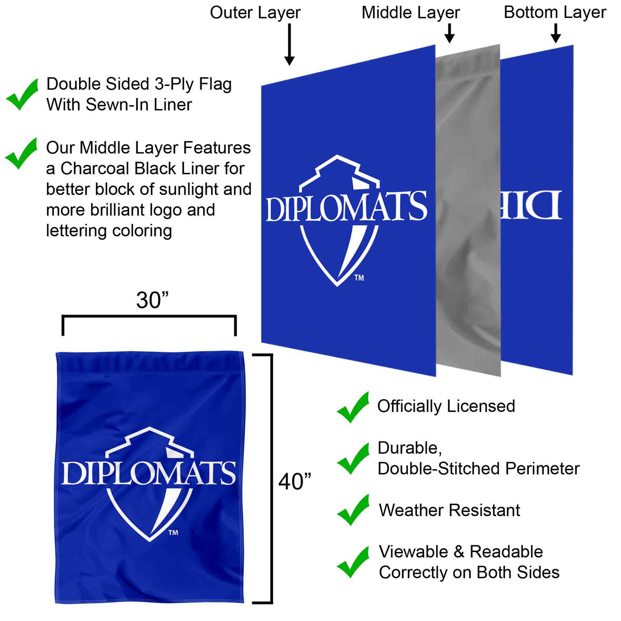 This Flag, Banner or Pennant measures 30 in x 40 in in size, is made of 2-Ply Polyester with sewn liner, and has a top pole sleeve to slide over your flagpole or banner pole. These House Flags are League and Team, College, or University Officially Licensed and the double sided Screen Printed logos are Viewable and Readable Correctly on Both Sides.