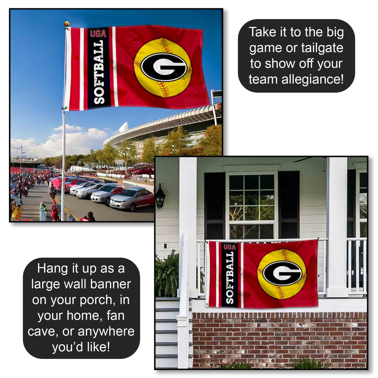 This Flag, Banner, or Pennant measures 3 ft x 5 ft in size, has Quadruple Stitched fly ends, is made of 150D Polyester, and has two Metal Grommets for attaching to your flagpole or tailgating flag pole. The Screen Printed UGA Bulldogs Championship logos are Officially Licensed by Sewing Concepts, Inc. and Officially Licensed and College, University, or Team Approved. The champs team logos, words, and insignia are Viewable from Both Sides (Opposite Side is a Reverse Image).