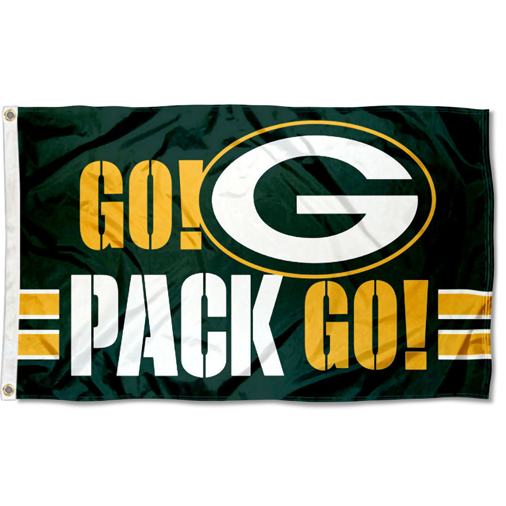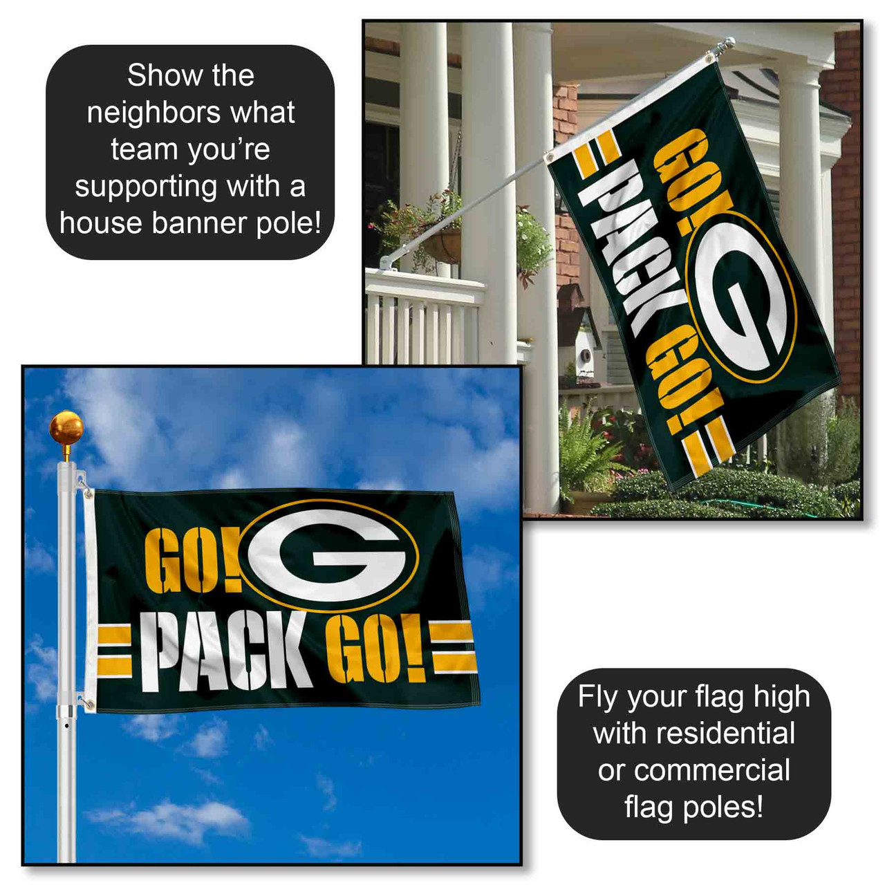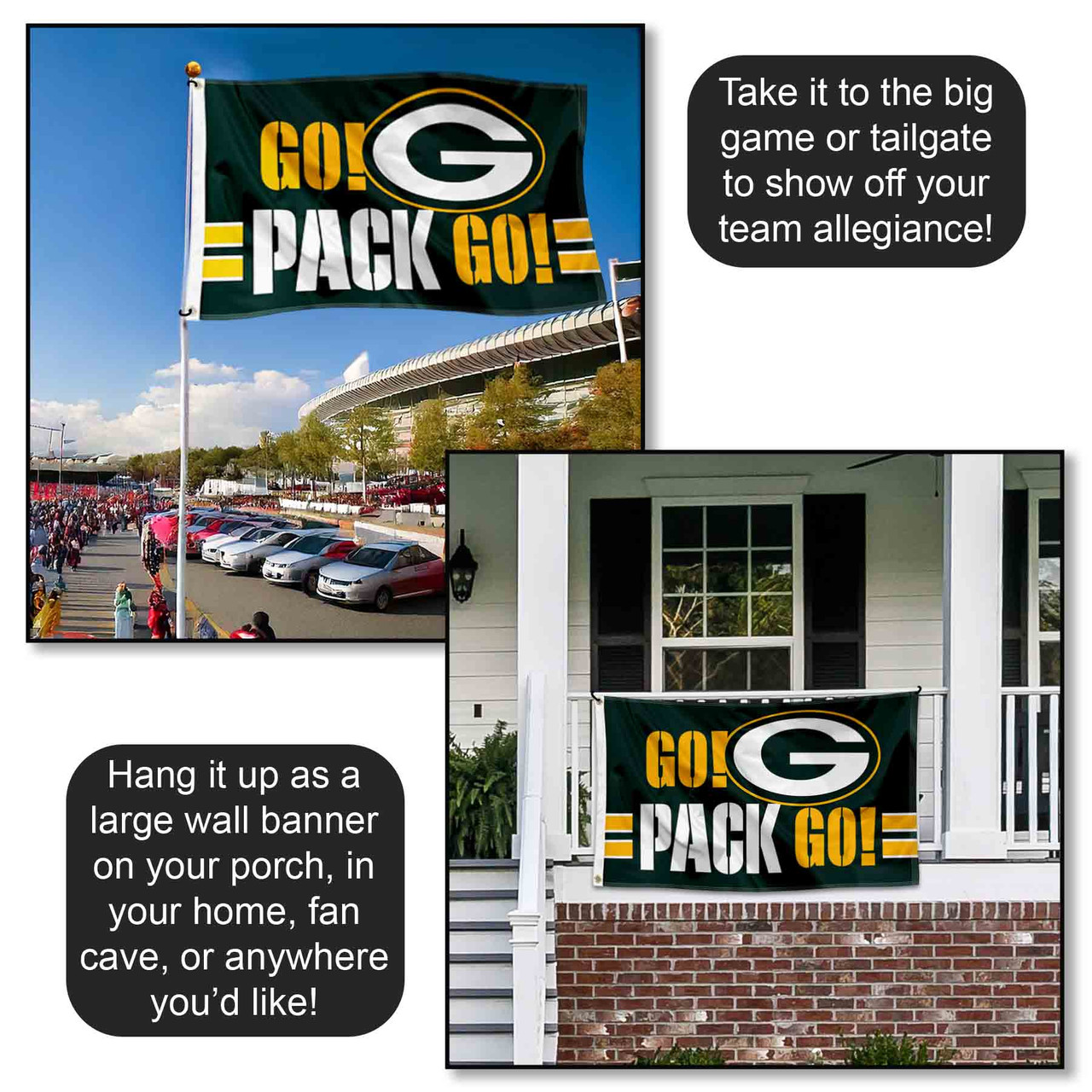 This Flag, Banner or Pennant measures 3x5 feet in size, has quadruple-stitched fly ends, is made of polyester, and has two metal grommets for attaching to your outdoor or any of our tailgate flagpole packages. The screen printed team logos are officially licensed and Green Bay Packers approved. This banner flag is viewable from both sides with the opposite side being a reverse image.