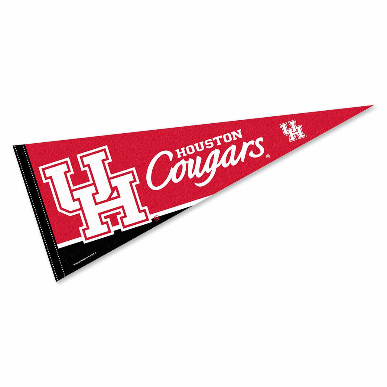 Our Houston Cougars Pennants are an easy way to show your college team allegiance in your sports room, game room, office, bedroom, or any room by displaying on any wall. These college pennants measure a full size 12x30 inches, are made of felt, and are single-sided screen printed with the school insignias and logos, as shown. Each University Houston Pennant Full Size Felt is Officially Licensed by the selected team and University Houston which insures current school insignias, wordmarks, and authentic college colors. The League pennants also include a pennant sleeve on the left side which can be used to insert a pennant stick, if desired.