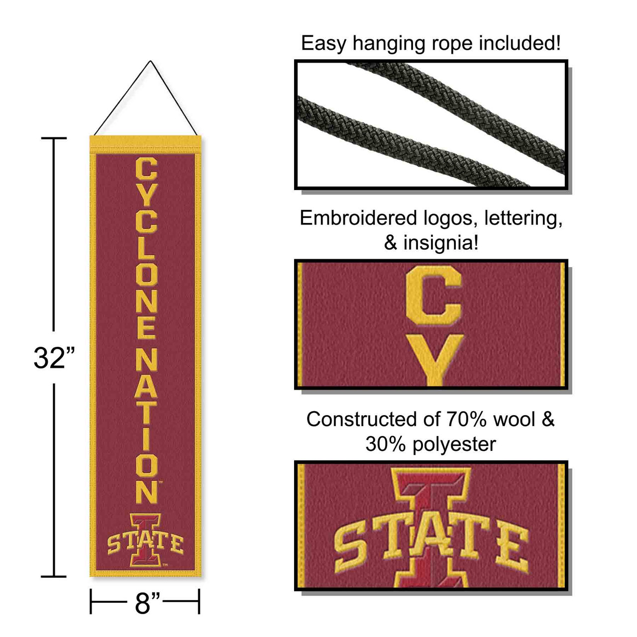 Iowa State University Cyclones Cyclone Nation 8x32 Inch Vertical Wool Embroidered Hanging Banner