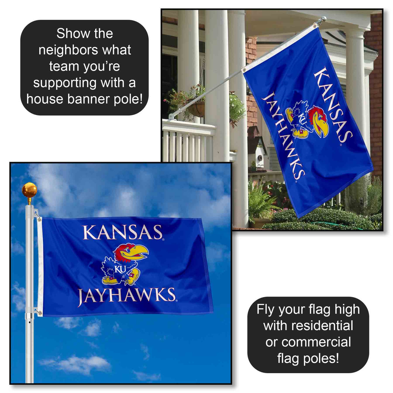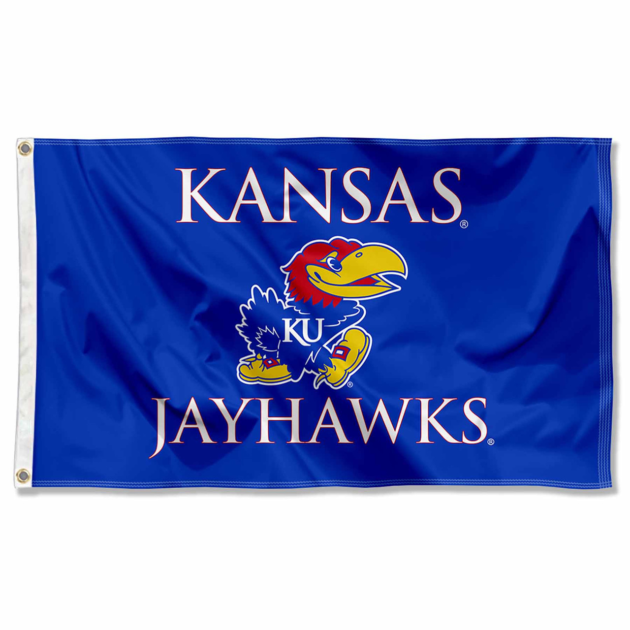 This outdoor Flag, Banner or Pennant measures 3 ft x 5 ft in size, has Quadruple Stitched fly ends, is made of durable Polyester, and has two Metal Grommets for attaching to your flagpole, tailgating flag pole, or for hanging as a large banner. The Screen Printed Kansas KU Jayhawks logos are Officially Licensed and Team, College, or University Approved approved. The printed insignia are Viewable from Both Sides (Opposite Side is a Reverse Image). Poles, Brackets, and Accessories sold separately.