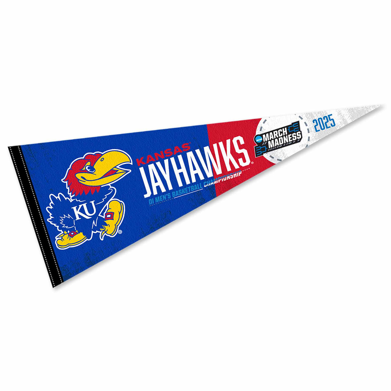 Our Pennant Flag is a great way to show your college allegiance in your sports room, game room, office, bedroom, or any room by displaying as a wall banner. These pennants measure 12 in X 30 in, are made of Felt, and are single-sided Screen Printed with Jayhawks insignias and logos. Each Flag, Banner or Pennant is Officially Licensed and Team, College, or University Approved approved which insures current insignias, wordmarks, and authentic colors. These pennants also include a sewn pennant stick sleeve on the left side which can be used to insert a pennant stick, if desired.