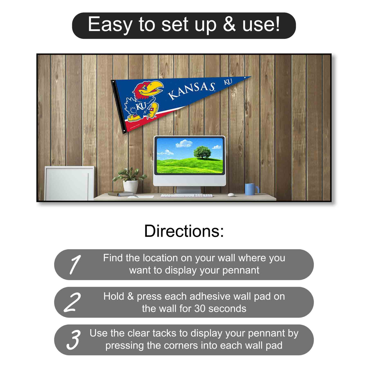 - Banner includes 12 in X 30 in Full Size Team Pennant and 6 adhesive mount pads and 6 clear tacks for displaying on any wall