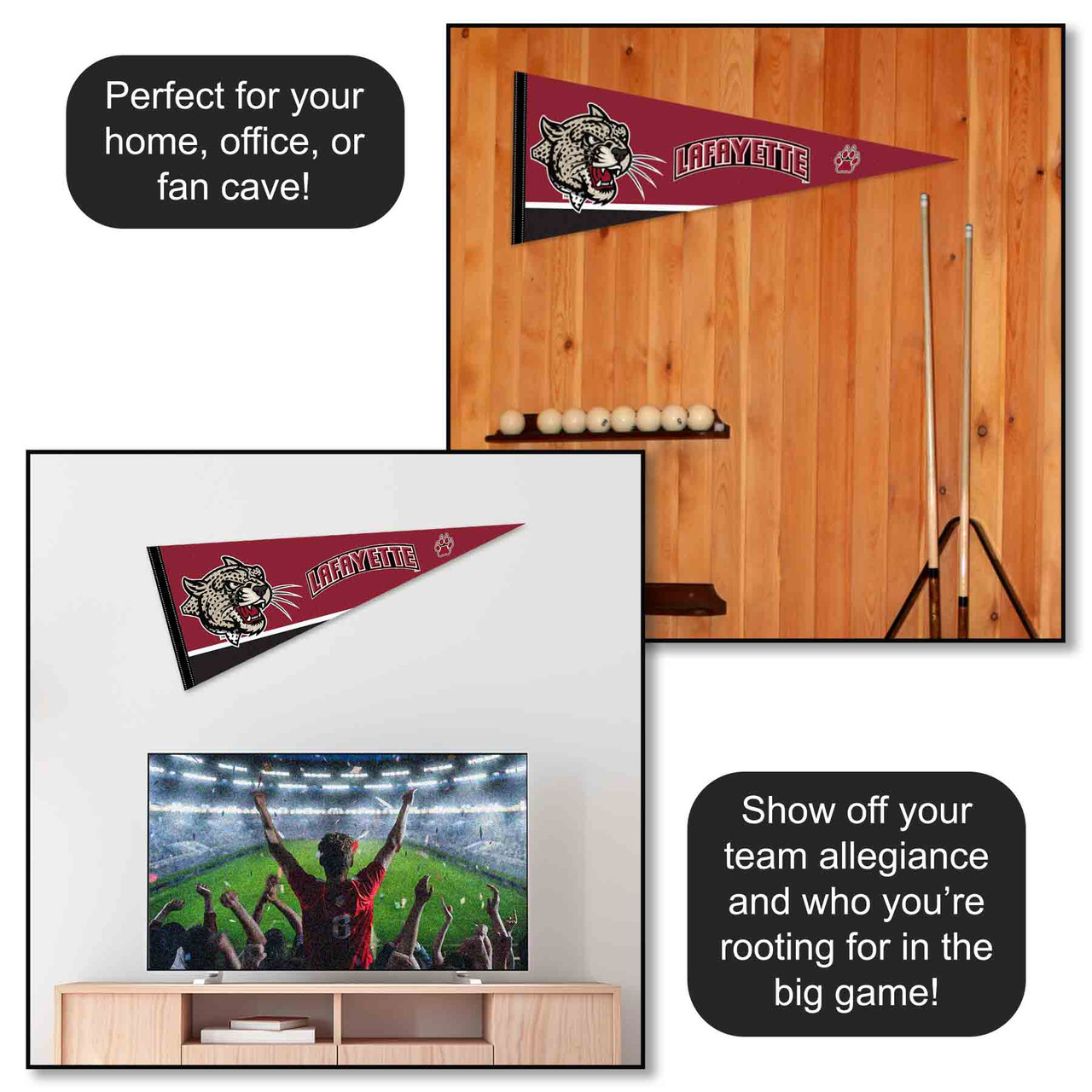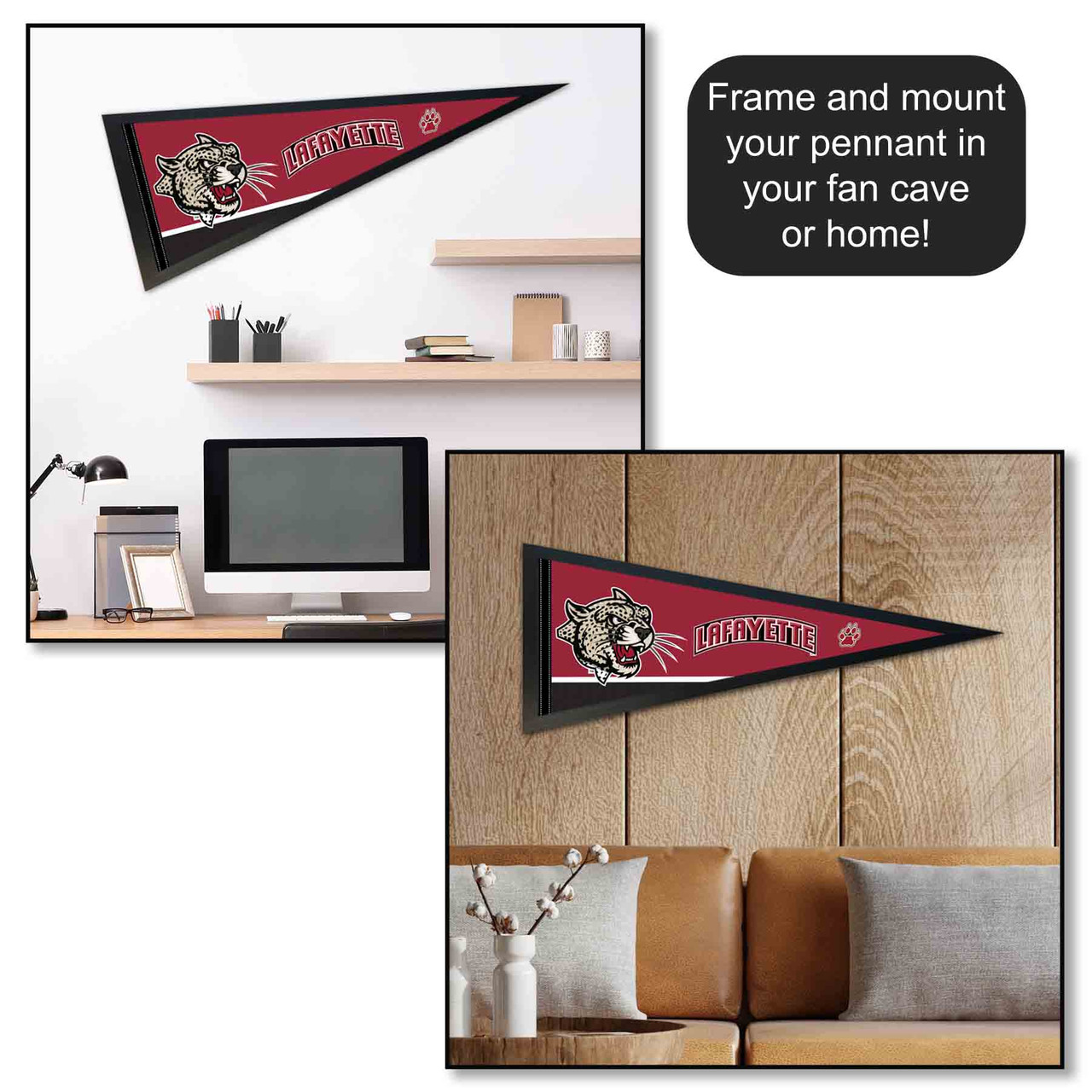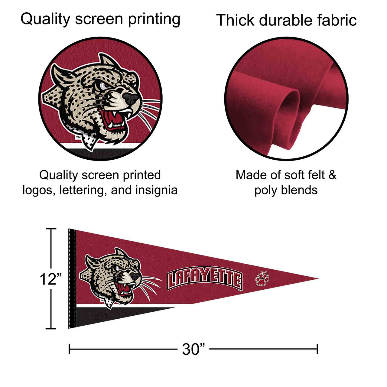 Our Lafayette College Pennants are an easy way to show your college team allegiance in your sports room, game room, office, bedroom, or any room by displaying on any wall. These college pennants measure a full size 12x30 inches, are made of felt, and are single-sided screen printed with the school insignias and logos, as shown. Each Lafayette Leopards Pennant Full Size Felt is Officially Licensed by the selected team and Lafayette College which insures current school insignias, wordmarks, and authentic college colors. The League pennants also include a pennant sleeve on the left side which can be used to insert a pennant stick, if desired.