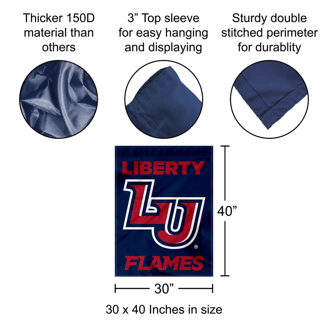 Our Liberty University Flames House Flag is 30x40 inches in size, is made of Two-Ply Polyester with Liner, has a top sleeve for insertion of a flagpole or banner pole, and is fully Double Sided. These House Banners and Flags are Viewable and Readable Correctly on both sides and are Officially Licensed by the League and Liberty University.