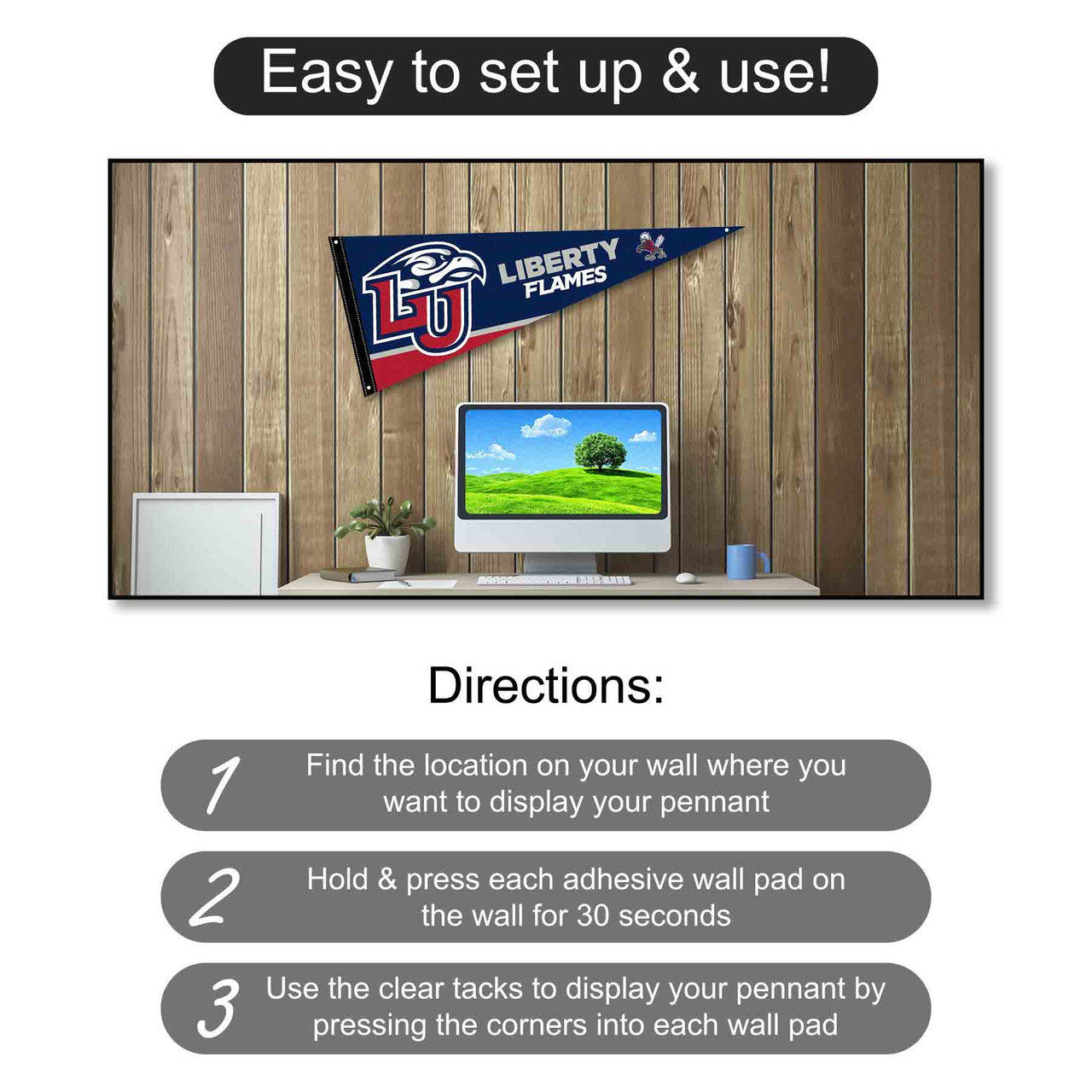 This logo banner set is a great way to show your team allegiance in your sports room, game room, office, bedroom, fan cave, garage, or any room by displaying on any wall. These pennant flags measure a full size 12 in X 30 in, are made of Felt, and are single-sided Screen Printed with the insignias and logos, as shown. Each banner is Officially Licensed by the selected team which insures current insignias, wordmarks, and authentic colors. Also, a pack of 6 Wall Pads and 6 Tacks are included which enable you to display on any wall. This ready to hang kit provides the pennant with a drop shadow while the tacks attach your pennant to the 3/8 inch thick adhesive wall pads. Easy directions are to find the location on the your wall to display your pennant. Hold and press each adhesive pad for 30 seconds. Use included tacks to display your pennant by pressing the corners into each pad.
