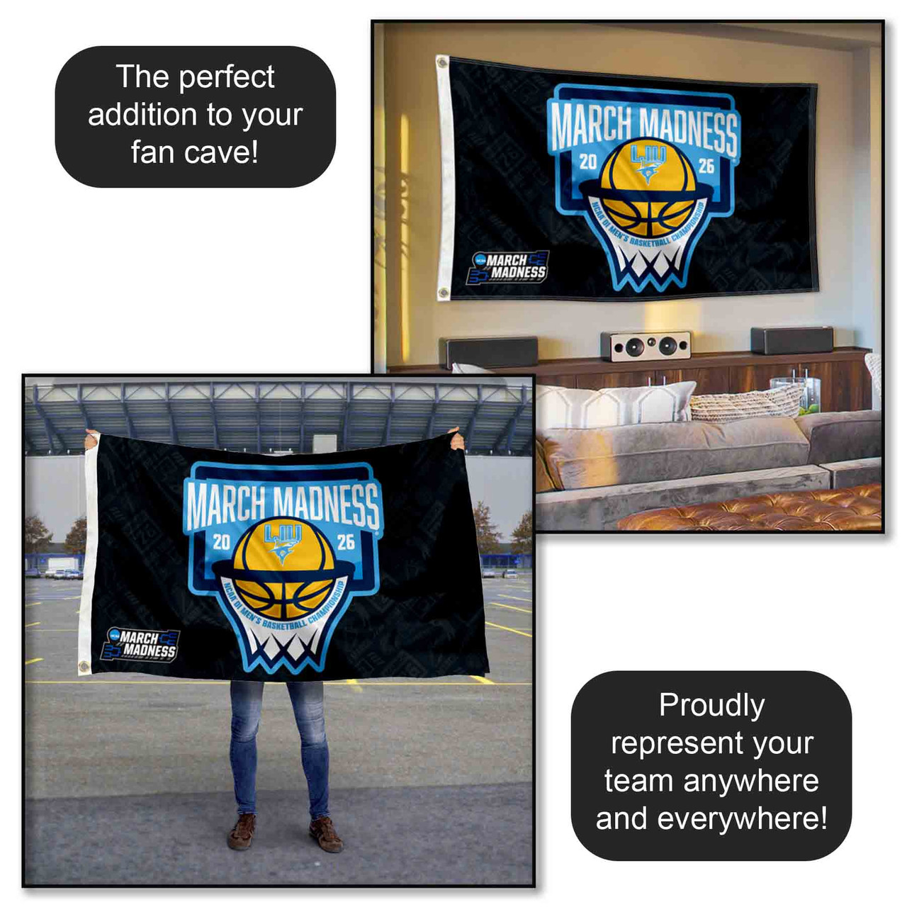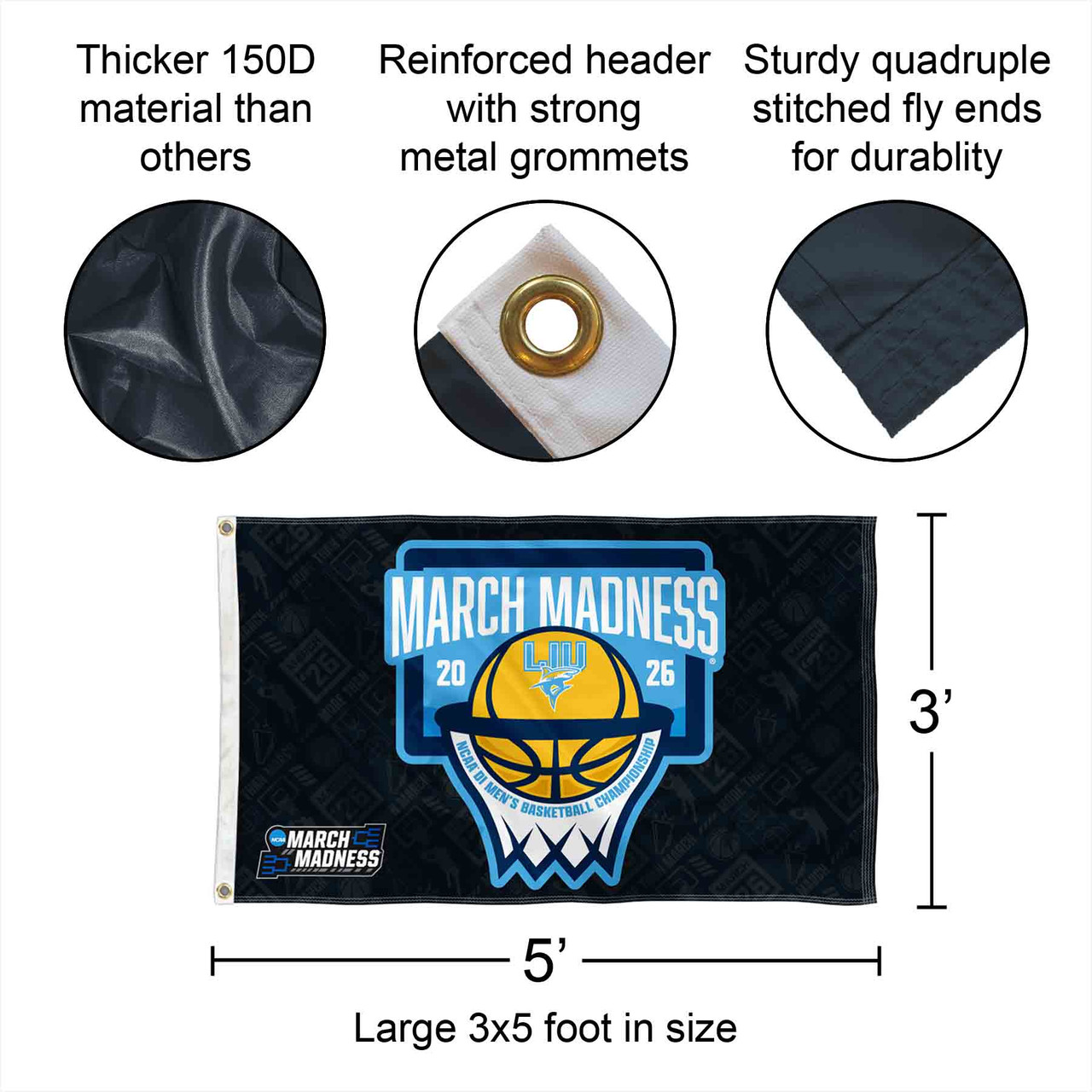 This Flag, Banner, or Pennant measures 3 ft x 5 ft in size, has Quadruple Stitched fly ends, is made of 150D Polyester, and has two Metal Grommets for attaching to your flagpole or tailgating flag pole. The Screen Printed LIU Sharks Championship logos are Officially Licensed by Sewing Concepts, Inc. and Officially Licensed and College, University, or Team Approved. The champs team logos, words, and insignia are Viewable from Both Sides (Opposite Side is a Reverse Image).
