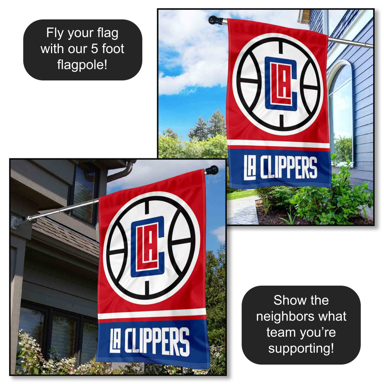 Our House Flag for the LA Clippers measures 28 in x 40 in in size, has a Double Stitched Perimeter, is made of 2-Ply Polyester with sewn-in liner, has Double Sided Screen Printed logos, and has a 3" top pole sleeve to slide over your flagpole or banner pole. This banner flag is Viewable and Readable Correctly on Both Sides and is League Genuine Merchandise which ensures a quality item, hologram packaging, authentic logos, and genuine team colors. (Flagpole, Brackets, and Accessories sold separately)