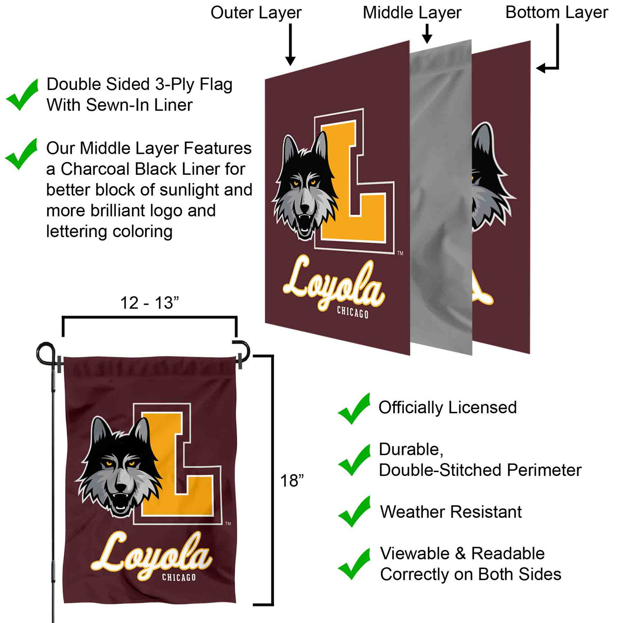 Ideal for your garden or home entrance is our garden banner flag. This double sided Garden Flag measures a large 13 in x 18 in, has a Double Stitched border, a 1 inch top sleeve, and is made of 2 ply Polyester so the logos are Viewable and Readable Correctly on Both Sides. The Screen Printed college logos are Officially Licensed and Approved by the League and school. (Flag Only, Garden Stand and Accessories Sold Separately)