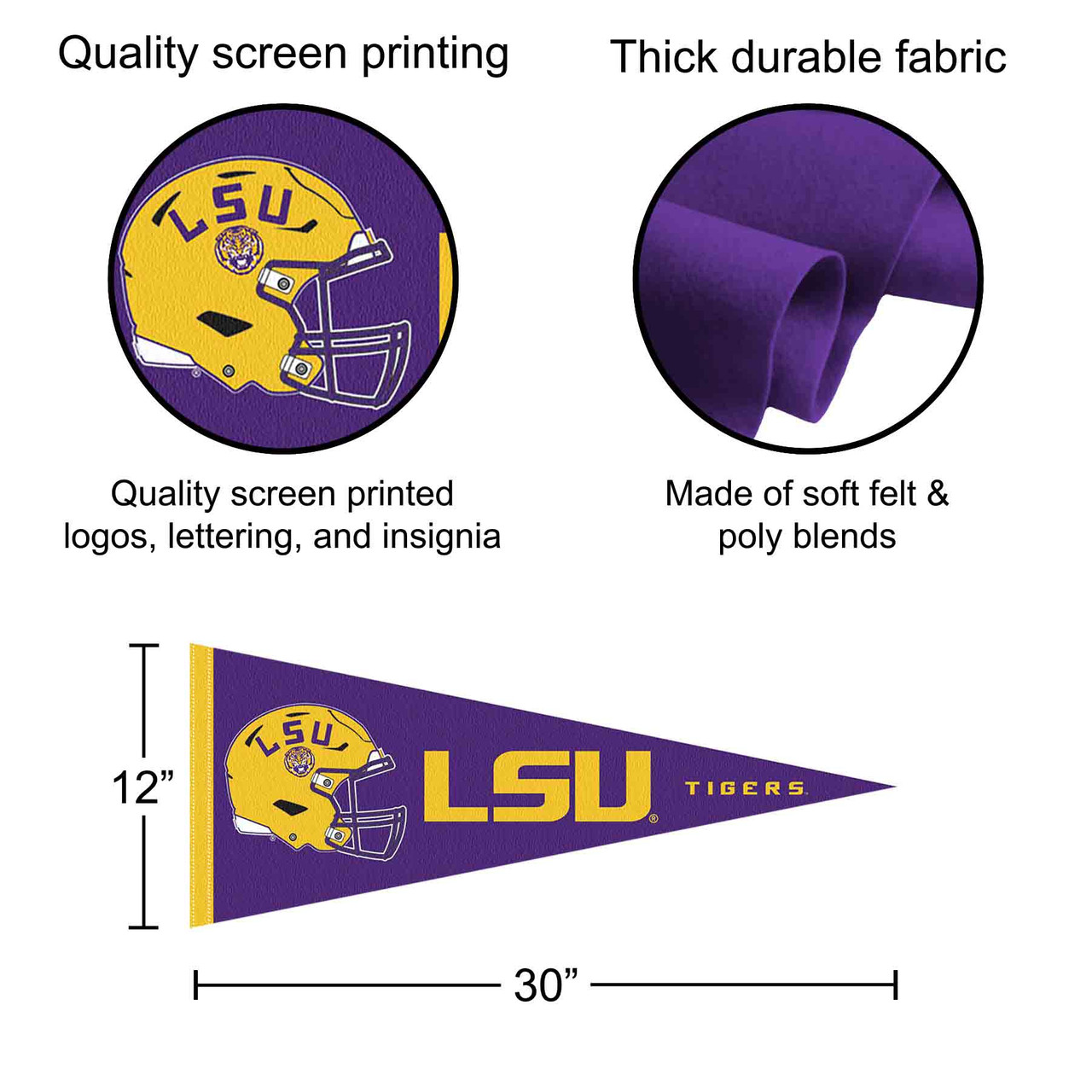Team Pennants are an easy way to display your team spirit in your sports room, game room, office, bedroom, fan cave, or any room by displaying on any wall. These pennant flags measure a full size 12 by 30 inches, are made of soft felt, and are single-sided screen printed with the school, college, team, or university insignias and logos as shown. Perfect as a party decorations and as wall banner decor.