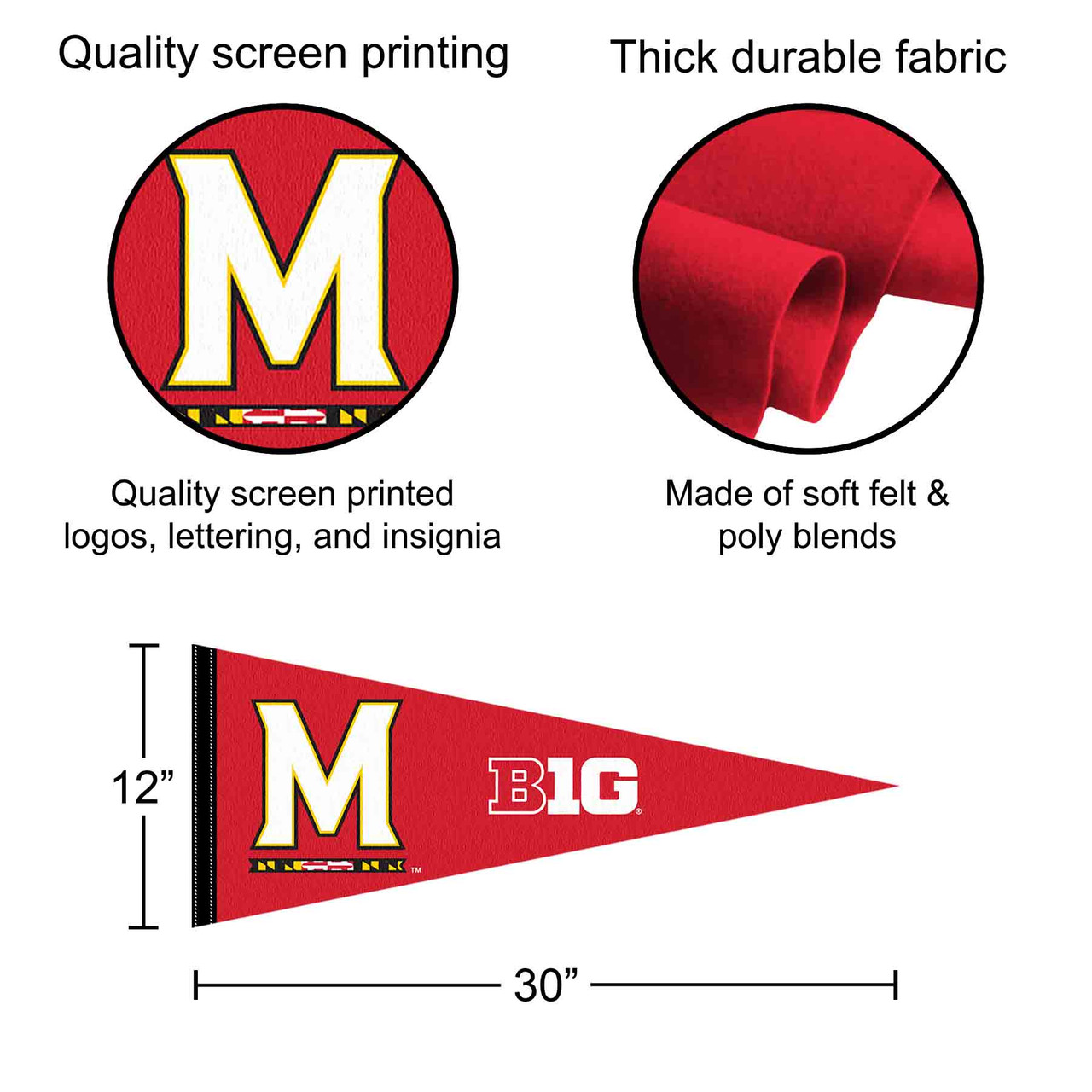 Our Pennant Flag is a great way to show your college allegiance in your sports room, game room, office, bedroom, or any room by displaying as a wall banner. These pennants measure 12 in X 30 in, are made of Felt, and are single-sided Screen Printed with Terrapins insignias and logos. Each Flag, Banner or Pennant is Officially Licensed and Team, College, or University Approved approved which insures current insignias, wordmarks, and authentic colors. These pennants also include a sewn pennant stick sleeve on the left side which can be used to insert a pennant stick, if desired.