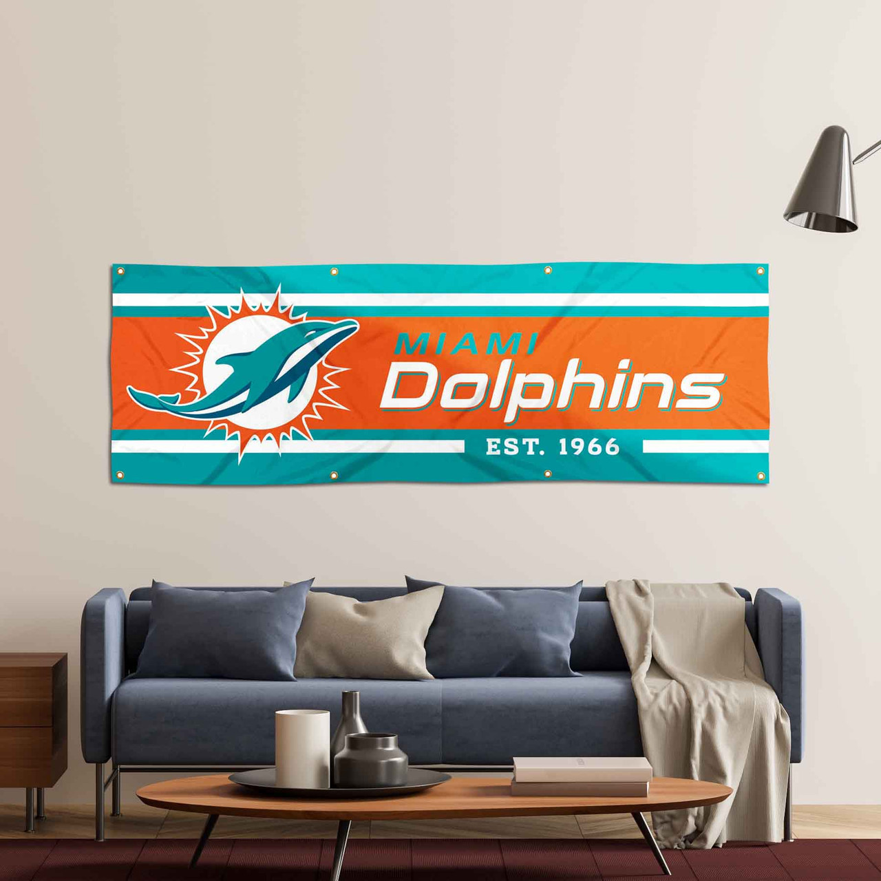 Our Large Banner measures 2 ft x 6 ft in Size, has a Double Stitched Perimeter, is made of 300d Polyester, and has 8 perimeter grommets for easy hanging. These large sports team banners are Officially Licensed and Team Approved and the Screen Printed logos, lettering, and insignia are Viewable from One Side.