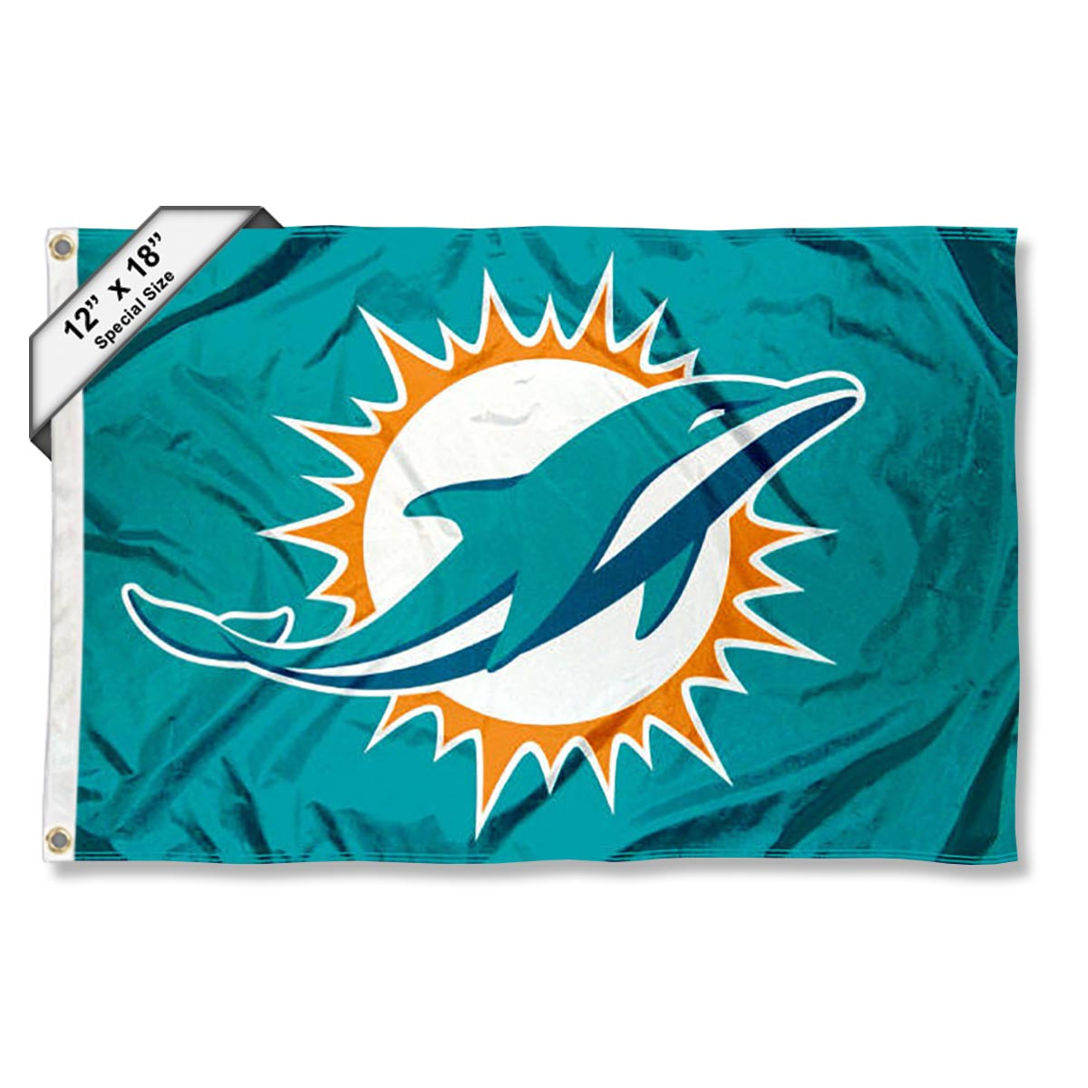 This Miami Dolphins Golf Cart and Boat Flag measures 12 in x 18 in in size, has Quadruple Stitched flyends, is made of 2-ply Polyester with sewn-in liner, includes Screen Printed logos, and has two Metal Grommets for attaching to your boat mount, golf cart pole, motorcycle mount, or any of your uses. These small flags are League Officially Licensed and the logos are Viewable and Readable Correctly on Both Sides.