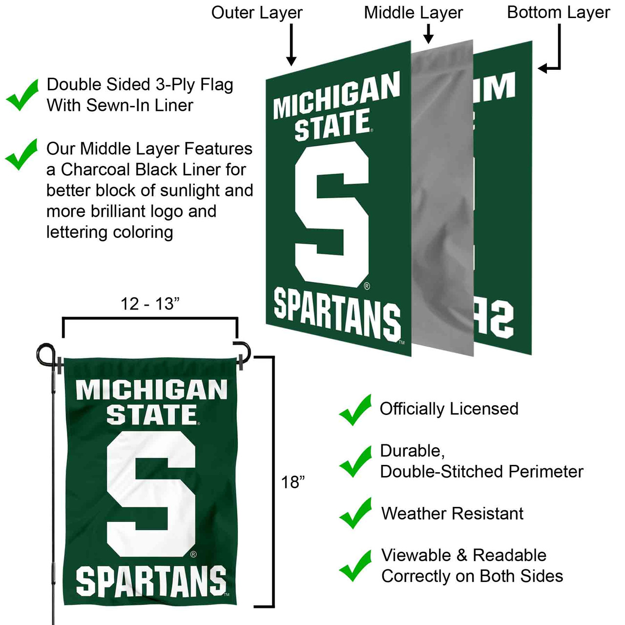 Perfect for your garden or home entrance is our MSU Spartans Garden Flag and Yard Banner. This double sided college garden flag measures a large 13x18 inches, has a double-stitched border, a 1 inch top sleeve, and is made of 2 ply polyester with liner so the logos are viewable and readable correctly on both sides. The screen printed Spartans logos are Officially Licensed and Approved by the Michigan State University. (Flag Only, Accessories Sold Separately)