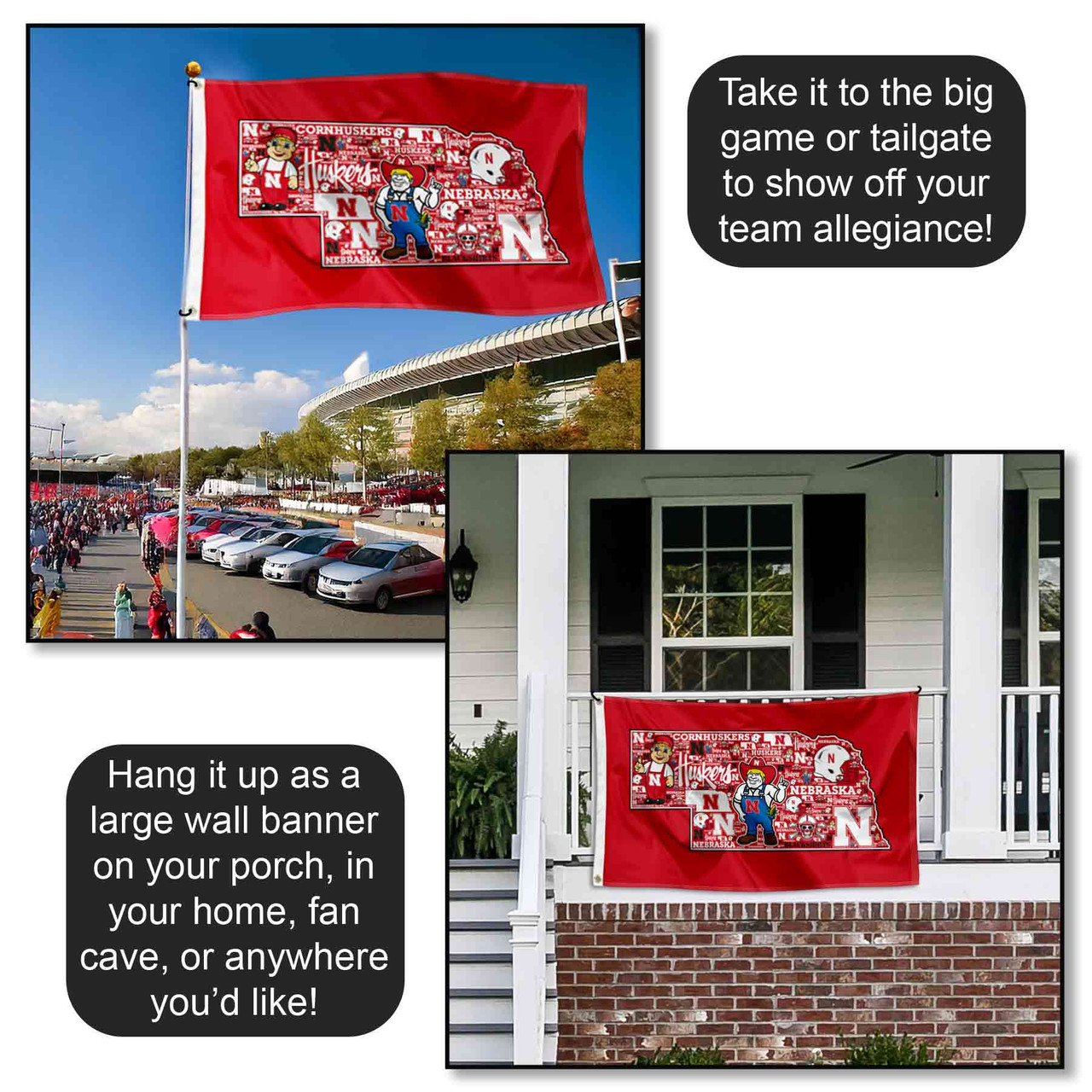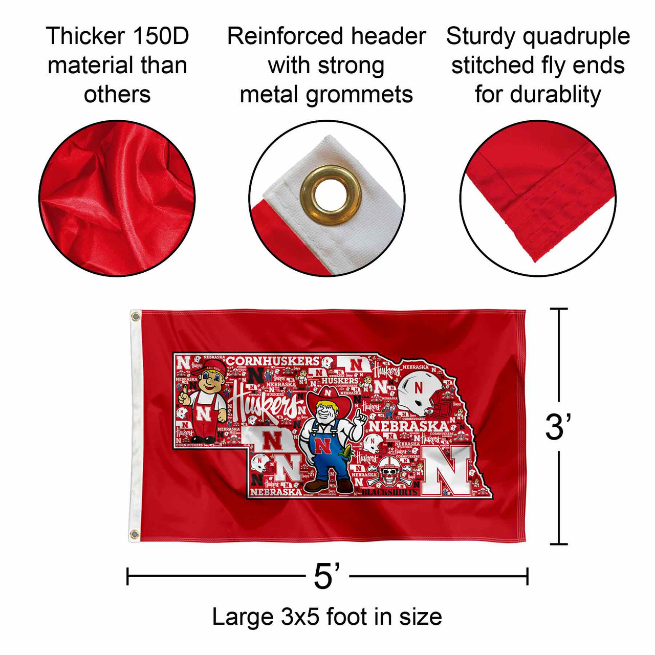 This Flag, Banner, or Pennant measures 3 ft x 5 ft in size, has Quadruple Stitched fly ends, is made of 150D Polyester, and has two Metal Grommets for attaching to your flagpole or tailgating flag pole. The Screen Printed Nebraska Huskers Championship logos are Officially Licensed by Sewing Concepts, Inc. and Officially Licensed and College, University, or Team Approved. The champs team logos, words, and insignia are Viewable from Both Sides (Opposite Side is a Reverse Image).