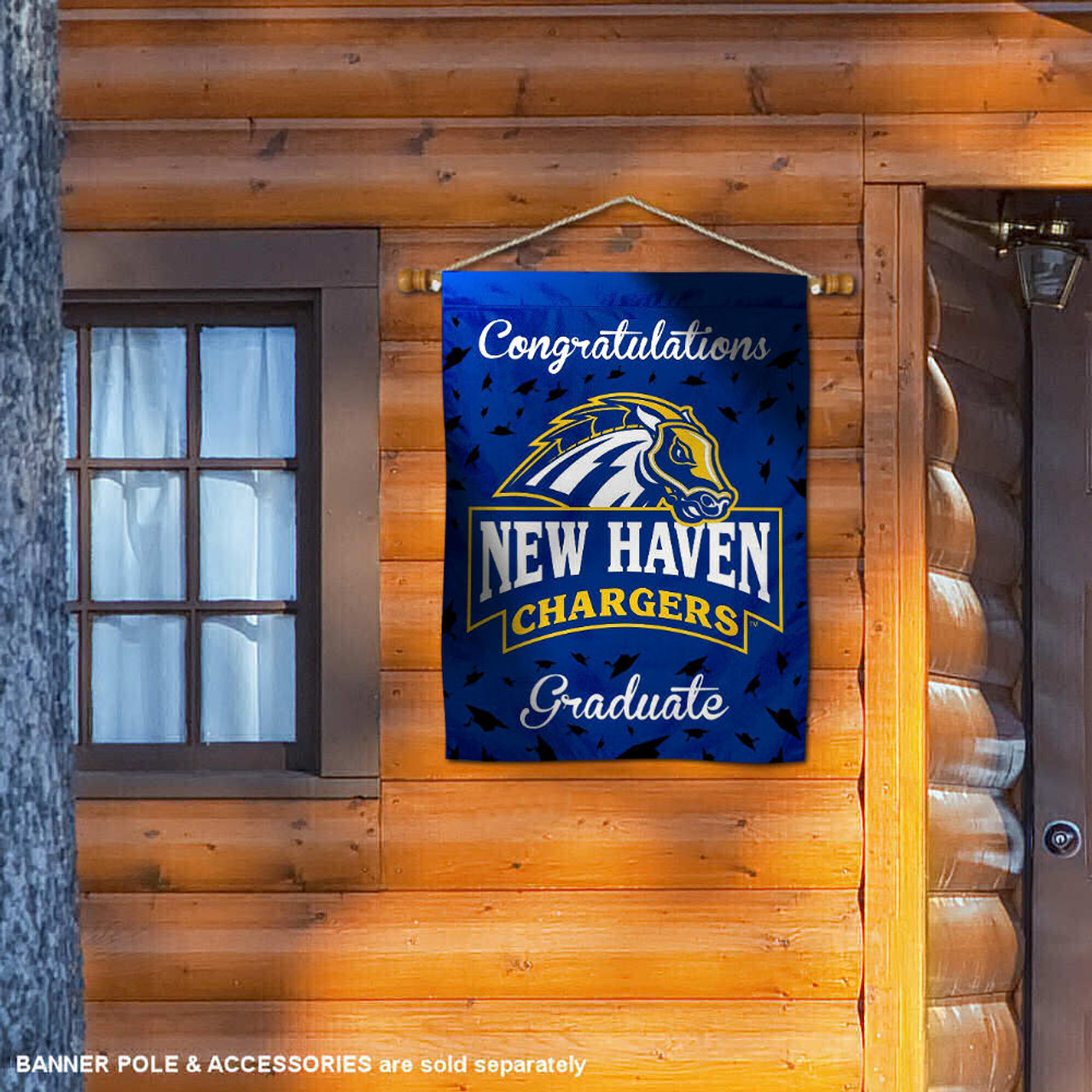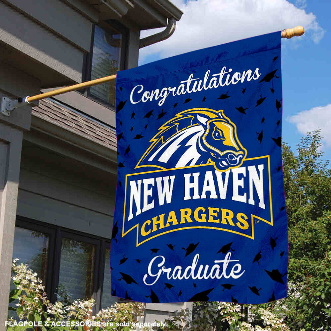 This graduate banner flag measures 30 in x 40 in in size, has a Double Stitched Perimeter, is made of Single-Ply Polyester, and has a top pole sleeve to slide your flagpole or banner pole. These House Flags are Officially Licensed and university approved. This flag is made of 1-ply so the logos are Viewable on Both Sides (Opposite Side is a Reverse Image). A unique graduation present, grad gift, or displayed as a wall banner.