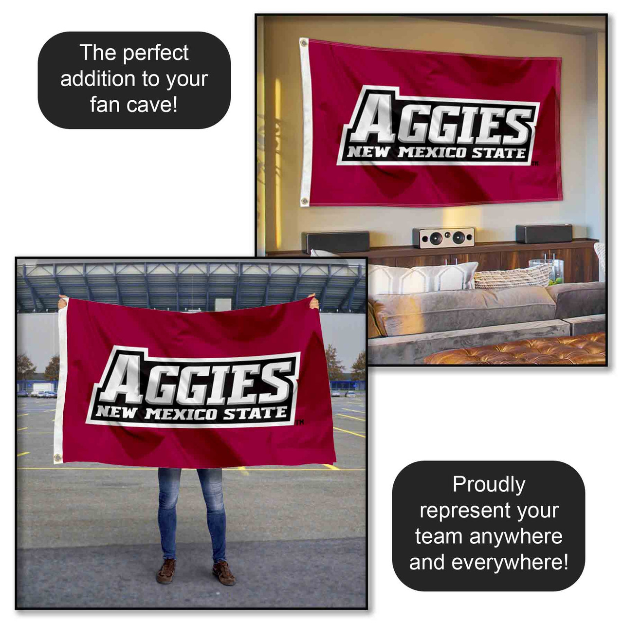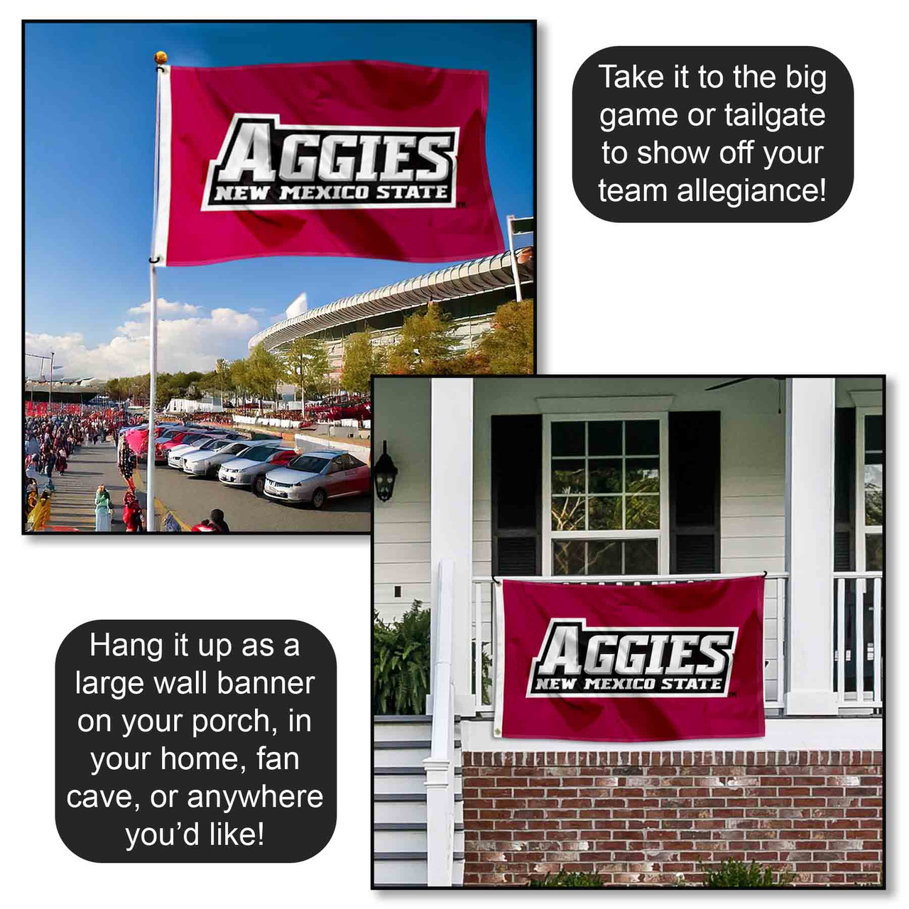 Our New Mexico State Aggies Flag measures 3x5 feet in size, has quadruple-stitched fly ends, is made of durable polyester, and has two metal grommets for attaching to your flagpole. The screen printed New Mexico State Aggies logos are Officially Licensed and Approved by New Mexico State University and are viewable from both sides with the opposite side being a reverse image.