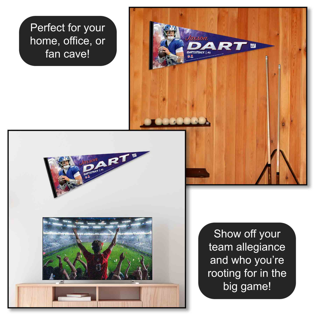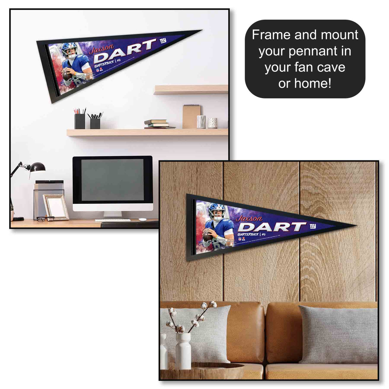 Our football pennants are a great way to show your League allegiance in your sports room, game room, office, bedroom, or any room by displaying on any wall as a banner. These pennant flags measure a full size 12 in X 30 in, are made of Felt Blend, and are single-sided Screen Printed with the insignias and logos, as shown. Each banner is Officially Licensed by the selected team which insures current insignias, wordmarks, and authentic colors. These pennants also include a pennant sleeve on the left side which can be used to insert a pennant stick, if desired.