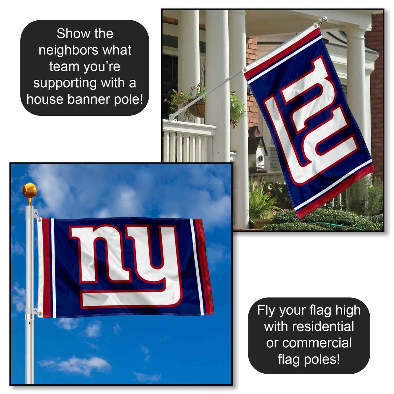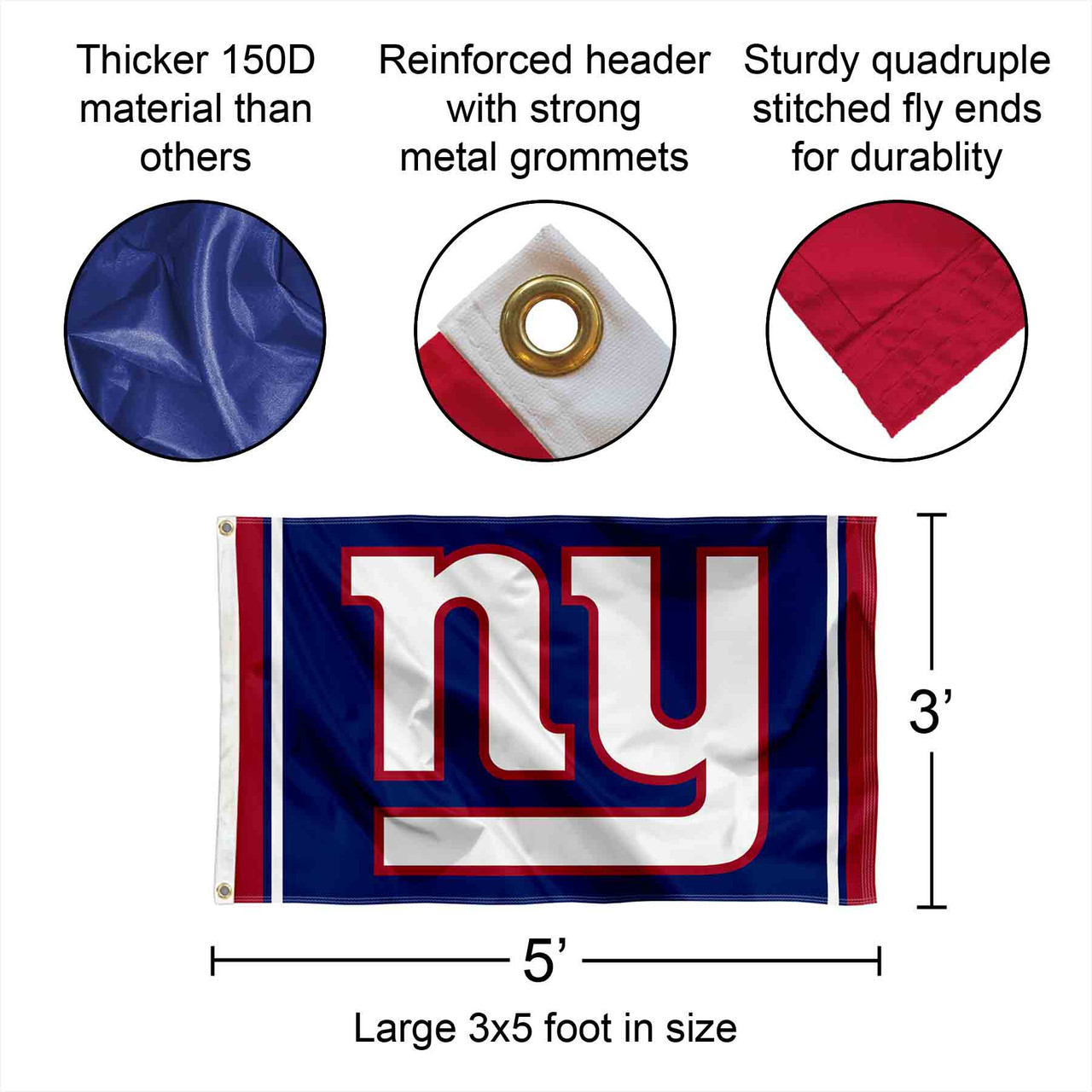 This banner flag measures 3x5 feet in size, has quadruple-stitched fly ends for extra durability, is made of 150d thickness polyester, and has two metal grommets for attaching to your outdoor or tailgate flagpole. The screen printed NY Giants Team logos are Officially Licensed by the League and are viewable from both sides with the opposite side being a reverse image.