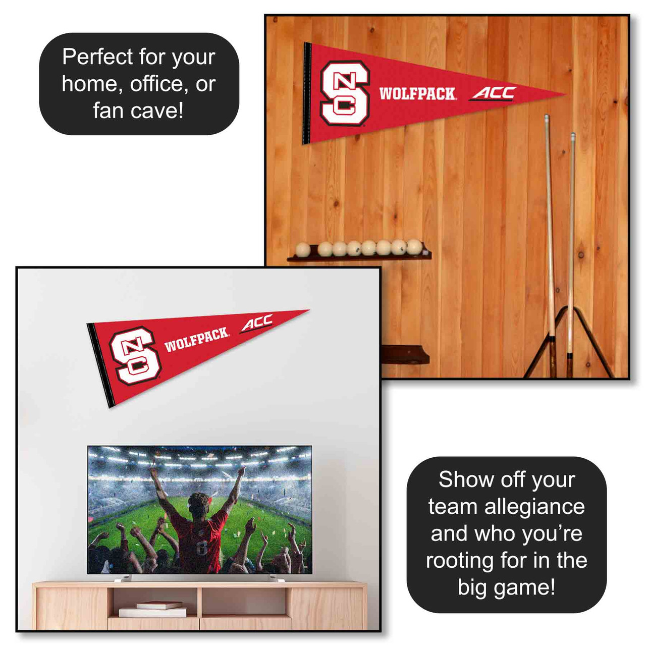 Our Pennant Flag is a great way to show your college allegiance in your sports room, game room, office, bedroom, or any room by displaying as a wall banner. These pennants measure 12 in X 30 in, are made of Felt, and are single-sided Screen Printed with Wolf Pack insignias and logos. Each Flag, Banner or Pennant is Officially Licensed and Team, College, or University Approved approved which insures current insignias, wordmarks, and authentic colors. These pennants also include a sewn pennant stick sleeve on the left side which can be used to insert a pennant stick, if desired.