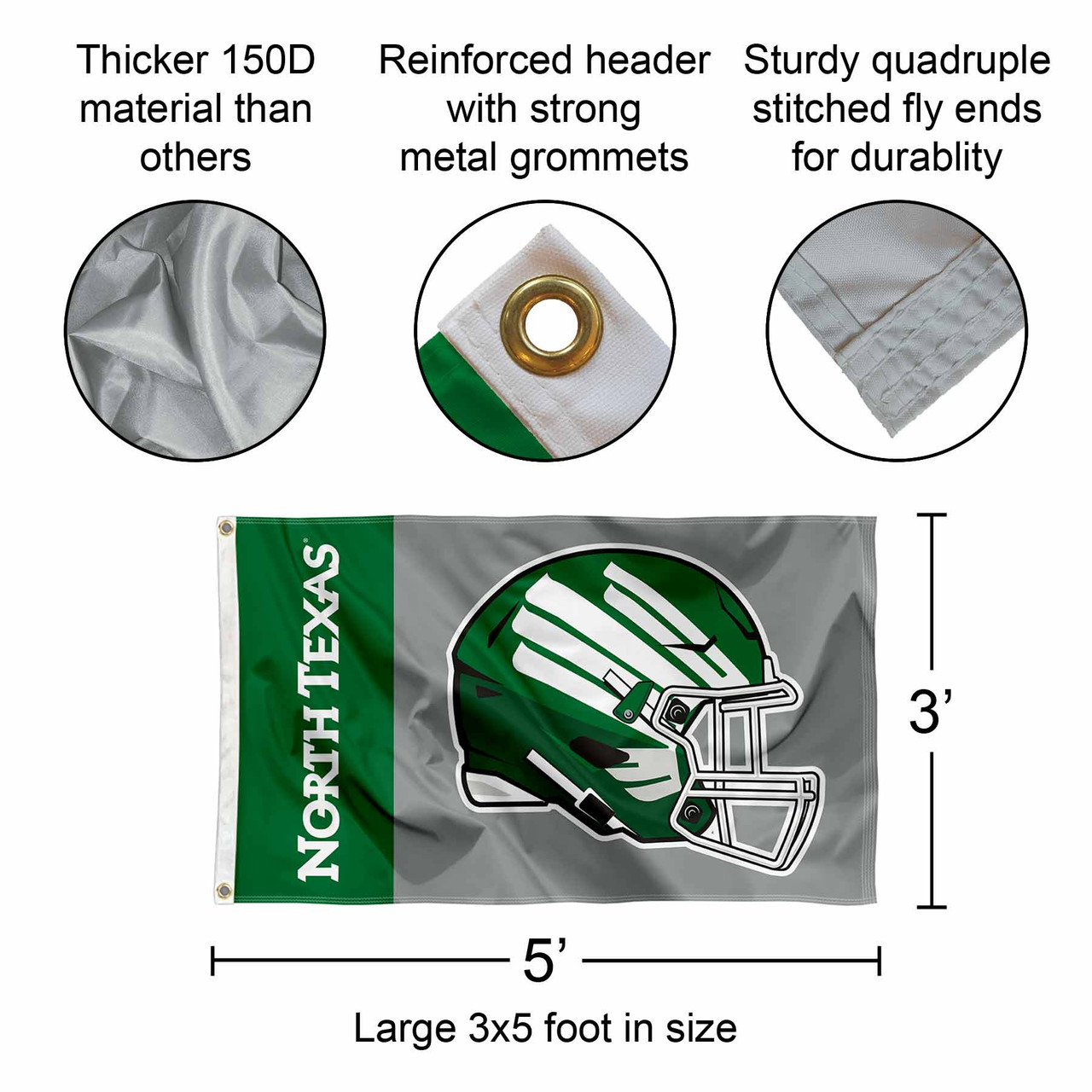 This Flag, Banner, or Pennant measures 3 ft x 5 ft in size, has Quadruple Stitched fly ends, is made of 150D Polyester, and has two Metal Grommets for attaching to your flagpole or tailgating flag pole. The Screen Printed UNT Mean Green Championship logos are Officially Licensed by Sewing Concepts, Inc. and Officially Licensed and College, University, or Team Approved. The champs team logos, words, and insignia are Viewable from Both Sides (Opposite Side is a Reverse Image).