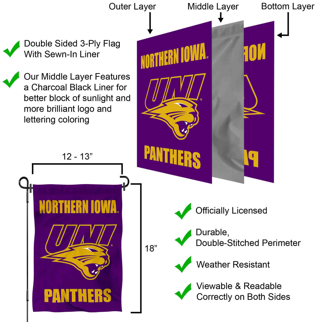 Perfect for your garden or home entrance is our Flag, Banner or Pennant. This double sided League Garden Flag measures a large 13 in x 18 in, has a Double Stitched border, a 1 inch top sleeve, and is made of 2 ply Polyester so the logos are Viewable and Readable Correctly on Both Sides. The Screen Printed UNI Panthers logos are Officially Licensed and Approved by the League and Team, College, or University Approved. (Flag Only, Garden Stand and Accessories Sold Separately)