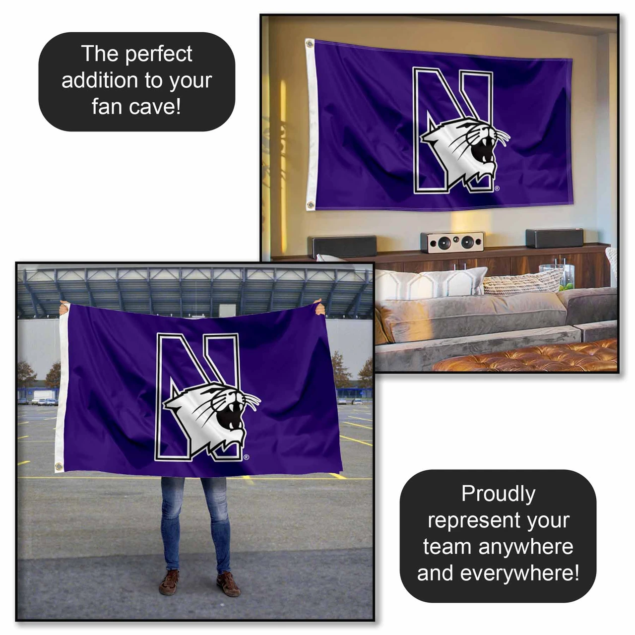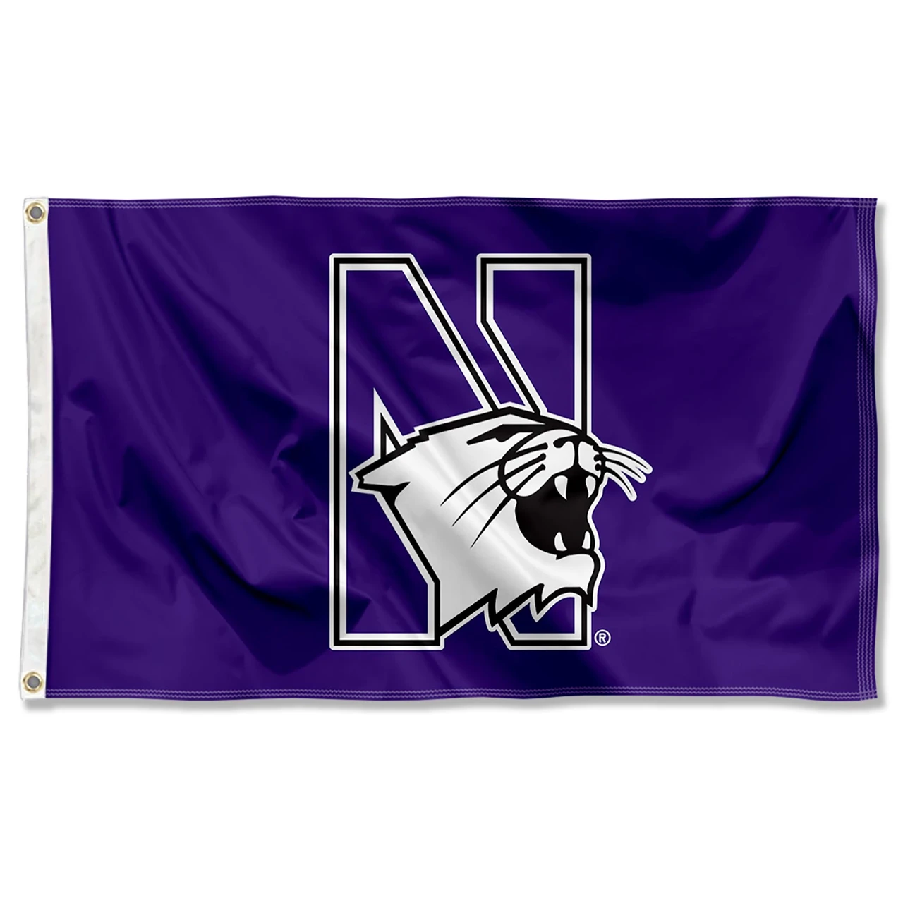 This Flag, Banner, or Pennant measures 3 ft x 5 ft in size, has Quadruple Stitched fly ends, is made of 150D Polyester, and has two Metal Grommets for attaching to your flagpole or tailgating flag pole. The Screen Printed Northwestern Wildcats Championship logos are Officially Licensed by Sewing Concepts, Inc. and Officially Licensed and College, University, or Team Approved. The champs team logos, words, and insignia are Viewable from Both Sides (Opposite Side is a Reverse Image).