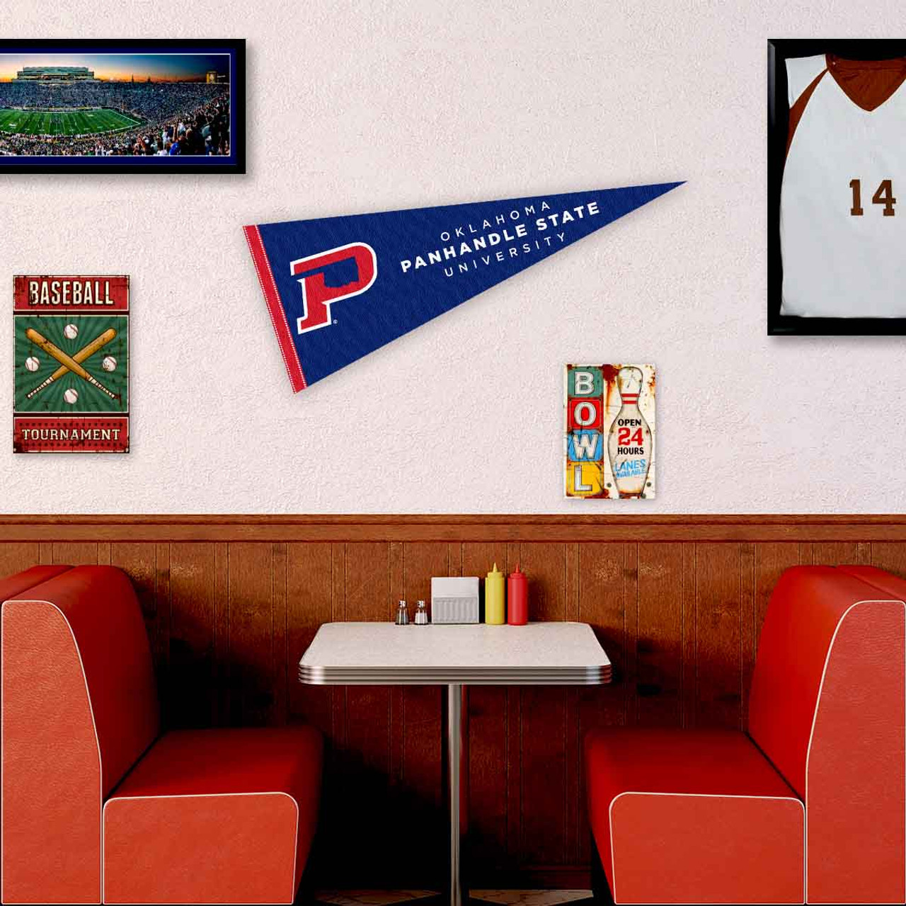 Our Flag, Banner or Pennant is a great way to show your college allegiance in your sports room, game room, office, bedroom, or any room by displaying as a wall banner. These pennants measure 12 in X 30 in, are made of Felt, and are single-sided Screen Printed with OPSU Aggies insignias and logos. Each Flag, Banner or Pennant is Officially Licensed and Team, College, or University Approved approved which insures current insignias, wordmarks, and authentic colors. These pennants also include a sewn pennant stick sleeve on the left side which can be used to insert a pennant stick, if desired.