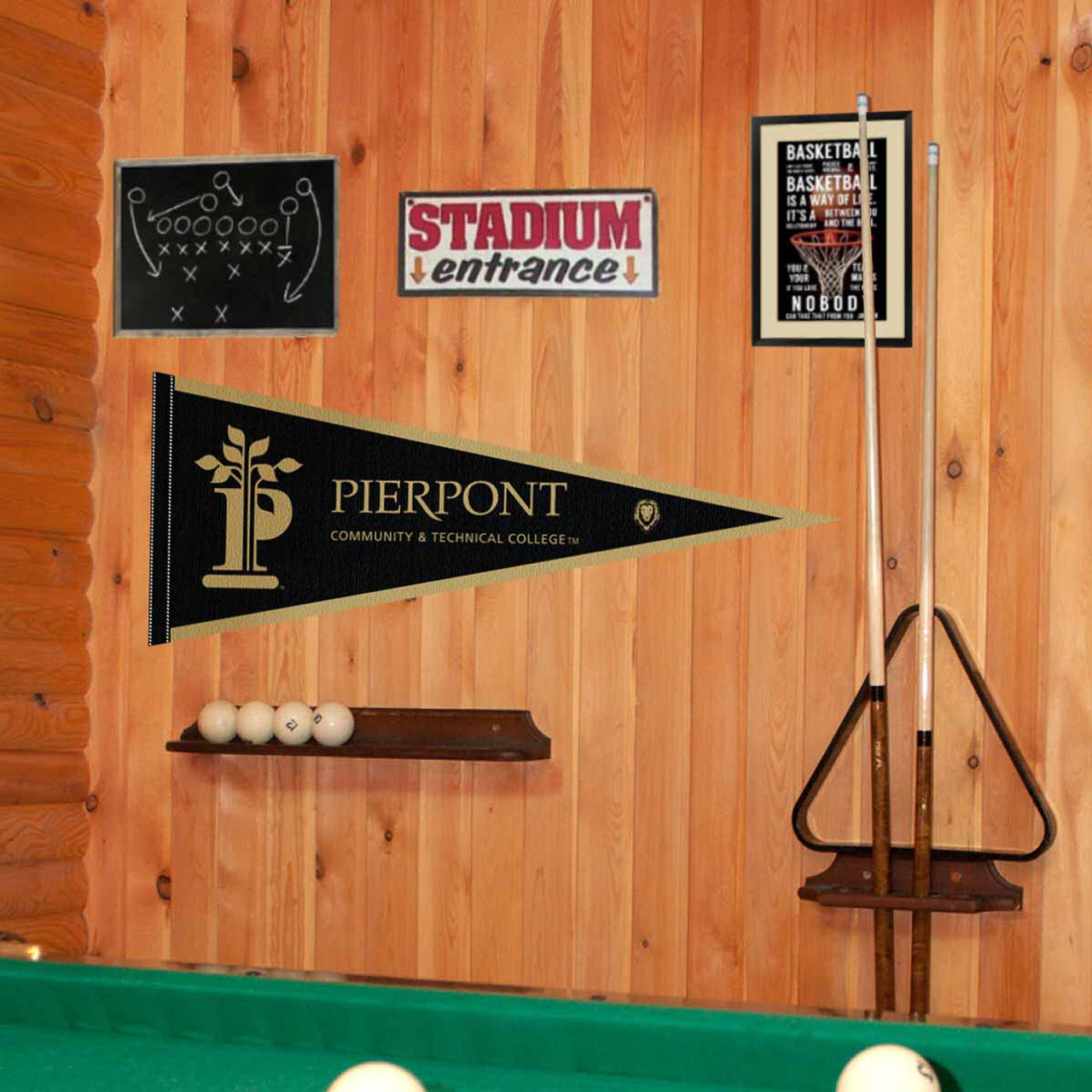 Our Flag, Banner or Pennant is a great way to show your tean allegiance in your sports room, game room, office, bedroom, or any room by displaying as a wall banner. These Pennants measure 12 in X 30 in, are made of Felt, and are single-sided Screen Printed with Pierpont Community College insignias and logos. Each Flag, Banner or Pennant is Officially Licensed and Team, College, or University Approved approved which insures current insignias, wordmarks, and authentic colors. These pennants also include a sewn pennant stick sleeve on the left side which can be used to insert a pennant stick, if desired.