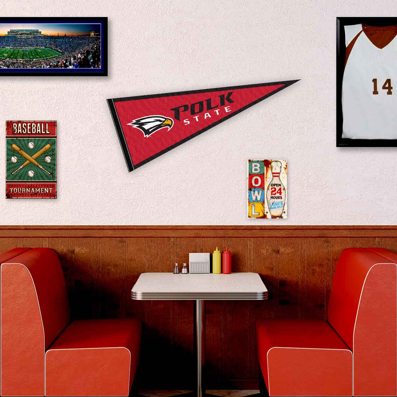 Our Flag, Banner or Pennant is a great way to show your college allegiance in your sports room, game room, office, bedroom, or any room by displaying as a wall banner. These pennants measure 12 in X 30 in, are made of Felt, and are single-sided Screen Printed with Polk Eagles insignias and logos. Each Flag, Banner or Pennant is Officially Licensed and Team, College, or University Approved approved which insures current insignias, wordmarks, and authentic colors. These pennants also include a sewn pennant stick sleeve on the left side which can be used to insert a pennant stick, if desired.