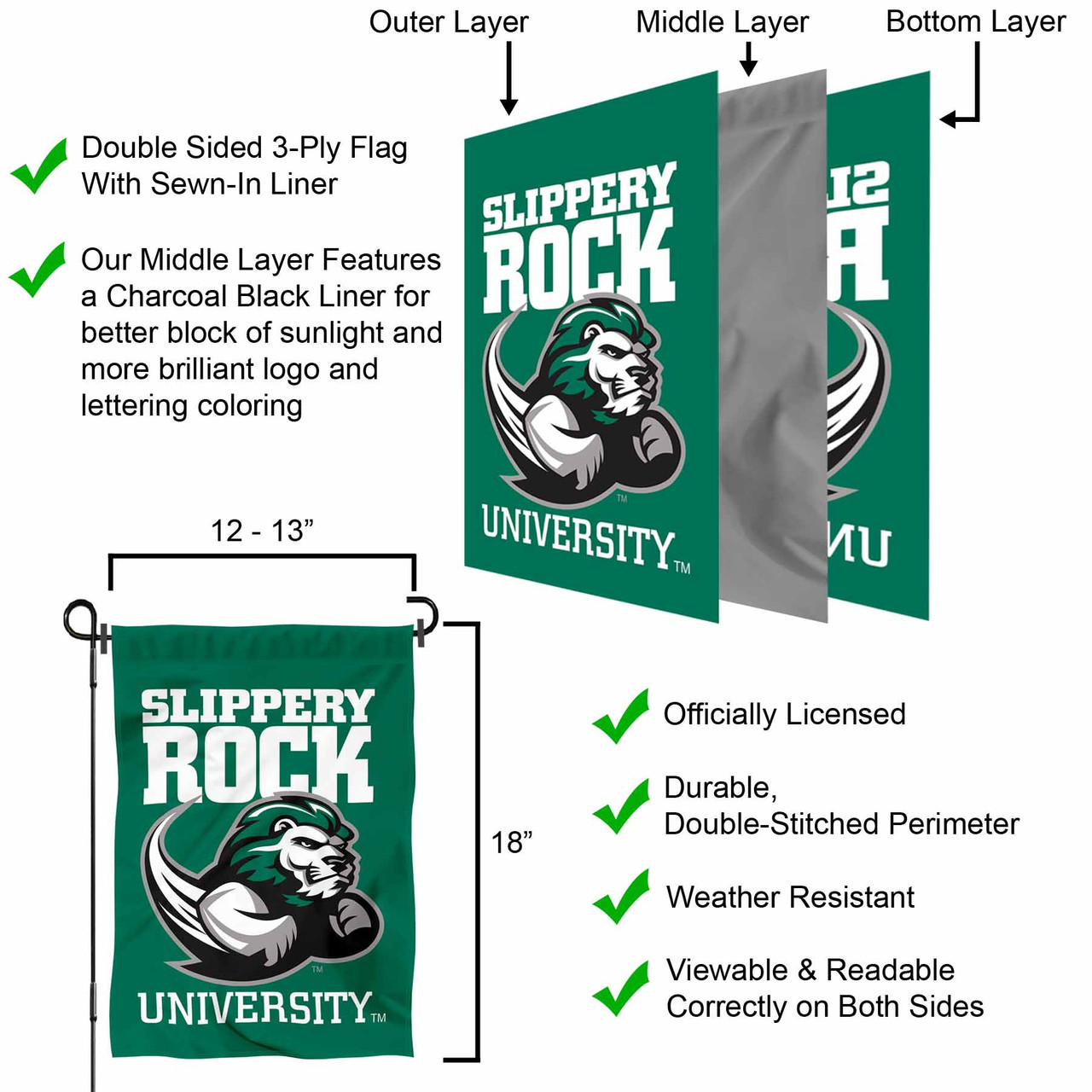 Ideal for your garden or home entrance is our garden banner flag. This double sided Garden Flag measures a large 13 in x 18 in, has a Double Stitched border, a 1 inch top sleeve, and is made of 2 ply Polyester so the logos are Viewable and Readable Correctly on Both Sides. The Screen Printed college logos are Officially Licensed and Approved by the League and school. (Flag Only, Garden Stand and Accessories Sold Separately)
