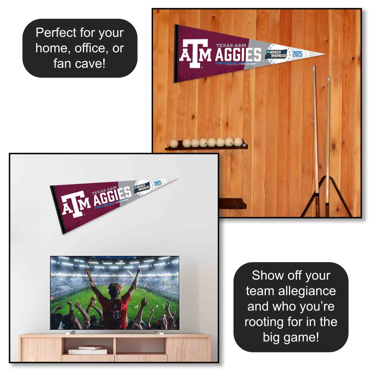 Our Pennant Flag is a great way to show your college allegiance in your sports room, game room, office, bedroom, or any room by displaying as a wall banner. These pennants measure 12 in X 30 in, are made of Felt, and are single-sided Screen Printed with Aggies insignias and logos. Each Flag, Banner or Pennant is Officially Licensed and Team, College, or University Approved approved which insures current insignias, wordmarks, and authentic colors. These pennants also include a sewn pennant stick sleeve on the left side which can be used to insert a pennant stick, if desired.