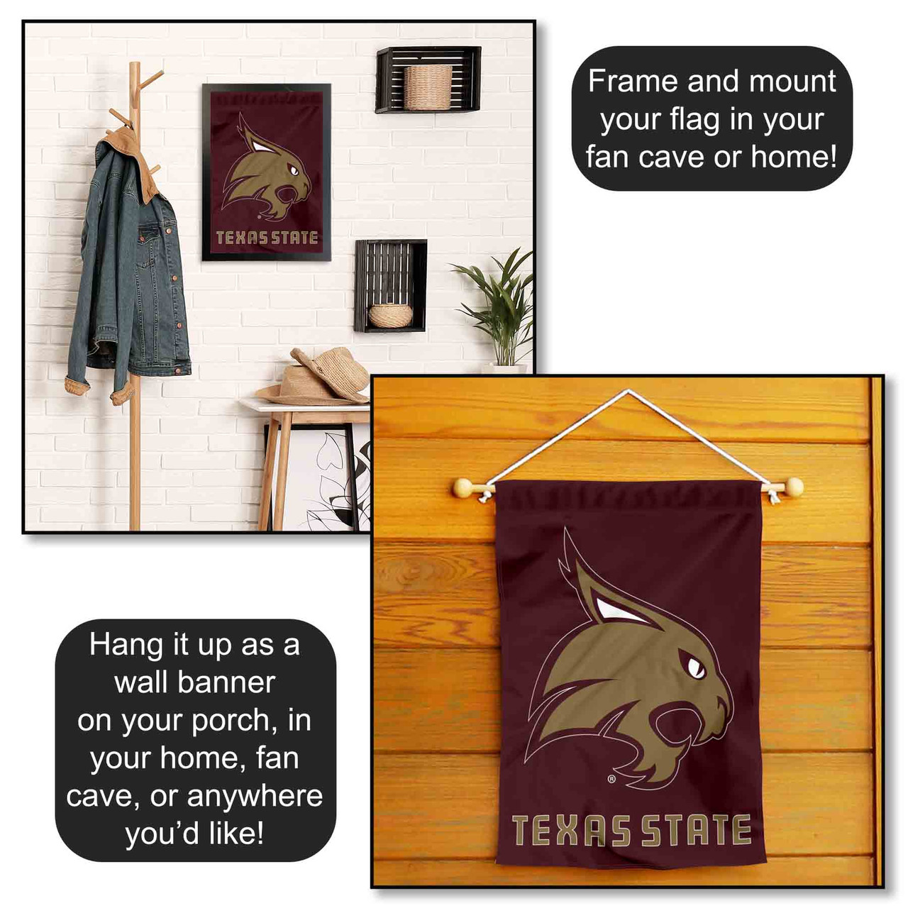 Perfect for your garden or home entrance is our Flag, Banner or Pennant. This double sided League Garden Flag measures a large 13 in x 18 in, has a Double Stitched border, a 1 inch top sleeve, and is made of 2 ply Polyester so the logos are Viewable and Readable Correctly on Both Sides. The Screen Printed Texas State Bobcats logos are Officially Licensed and Approved by the League and Team, College, or University Approved. (Flag Only, Accessories Sold Separately)