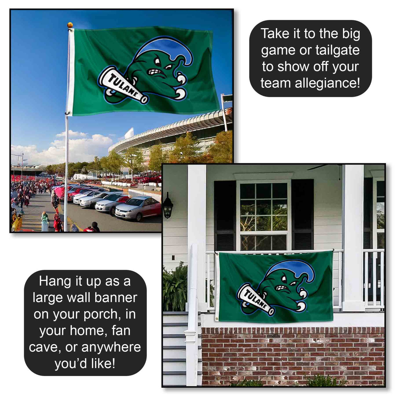 This Flag, Banner or Pennant measures 3 ft x 5 ft in size, has Quadruple Stitched fly ends, is made of durable Polyester, and has two Metal Grommets for attaching to your flagpole. The Screen Printed Tulane Green Wave logos are Officially Licensed and College, University, or Team Approved and are Viewable from Both Sides (Opposite Side is a Reverse Image).